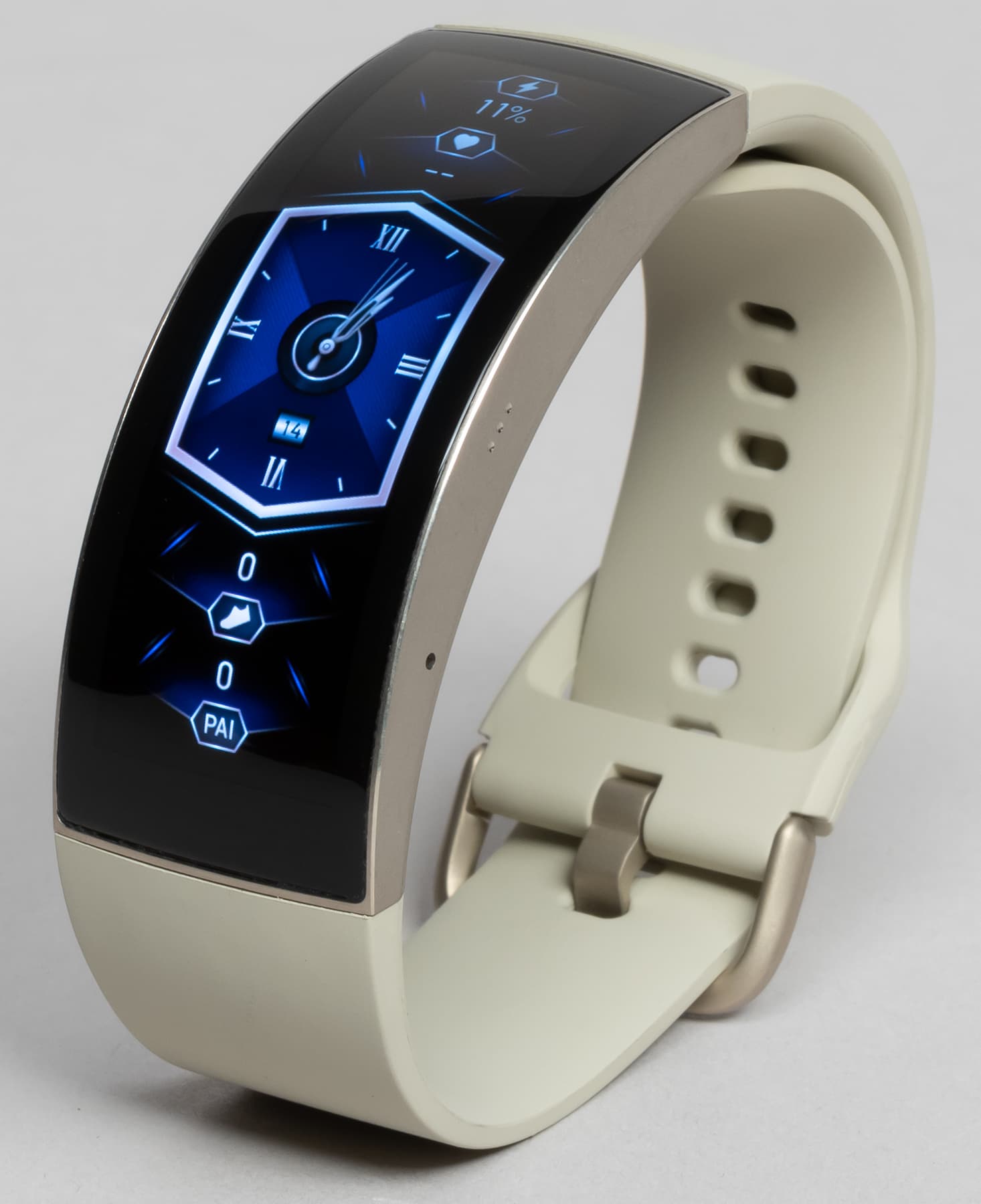 Главная особенность модели видна по любой фотографии: большой, сильно изогнутый дисплей. Производитель называет Amazfit X умными часами, однако мы все-таки считаем более корректным термин «фитнес-браслет», поскольку здесь нет полноценной операционной системы (с возможностью устанавливать сторонние приложения) или хотя бы типичного «часового» дизайна.