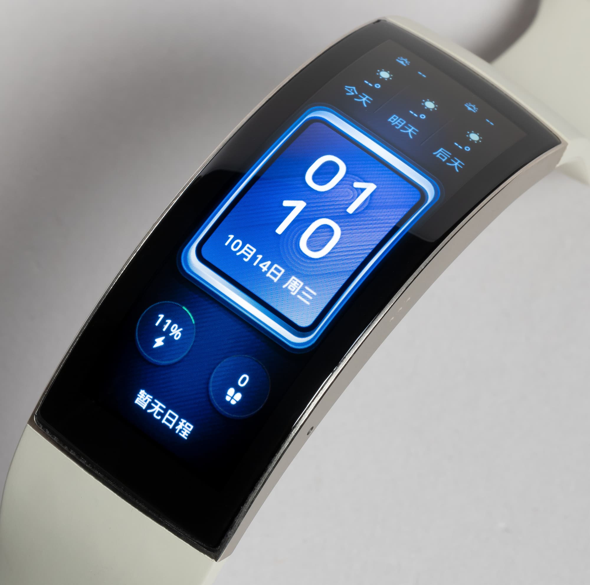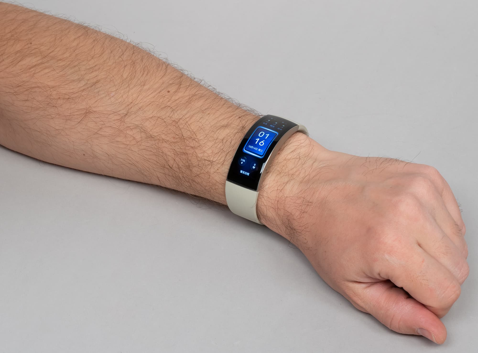 Конечно, именно из-за внешнего вида Amazfit X привлекает внимание. Здесь очень большой для фитнес-браслетов и, главное, сильно изогнутый дисплей, будто оборачивающий руку пользователя.