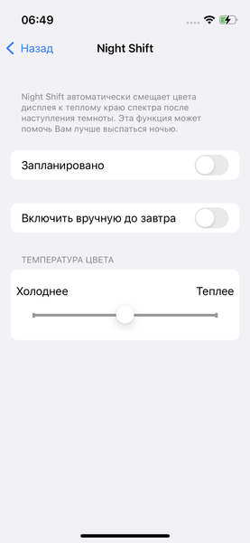В этом устройстве Apple есть функция Night Shift, которая ночью делает картинку теплее (насколько теплее — указывает пользователь). В принципе, яркий свет может приводить к нарушению суточного (циркадного) ритма (см. статью про iPad Pro с дисплеем 9,7 дюйма), но все решается снижением яркости до низкого, но еще комфортного уровня, а искажать цветовой баланс, уменьшая вклад синего, нет абсолютно никакого смысла.