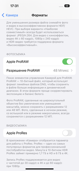 Чтобы активировать съемку в ProRes, надо опять-таки идти в Настройки / Камера, сдвигать там в активное положение рычажок напротив соответствующего пункта, а затем уже в приложении «Камера» сделать его неперечеркнутым — в общем, всё как с ProRAW. При этом частота кадров в 4К-видео будет ограничена 30 fps, тогда как для стандартного HEVC доступно 60 fps. Причина ограничения — та же, что и с фото: места в iPhone слишком мало для съемки в ProRes с максимальными параметрами.