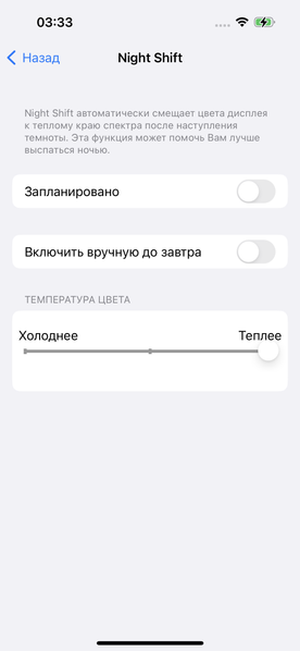 В этом устройстве Apple есть функция Night Shift, которая ночью делает картинку теплее (насколько теплее — указывает пользователь, в реальности от 6100 К до 2700 К). В принципе, яркий свет может приводить к нарушению суточного (циркадного) ритма (см. статью про iPad Pro с дисплеем 9,7 дюйма), но все решается снижением яркости до низкого, но еще комфортного уровня, а искажать цветовой баланс, уменьшая вклад синего, нет абсолютно никакого смысла.