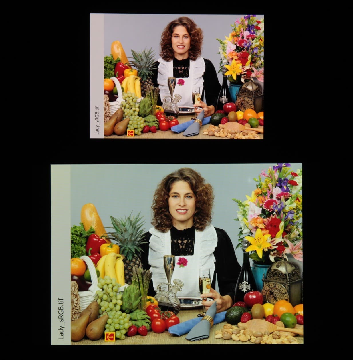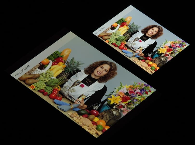 Это относится к тем изображениям, в которых прописан профиль sRGB или не прописано вообще никакого профиля. Однако родным для современных топовых устройств Apple является цветовое пространство Display P3 с немного более насыщенными зеленым и красным цветами. Пространство Display P3 основано на SMPTE DCI-P3, но имеет точку белого D65 и гамма-кривую с показателем примерно 2,2. Кроме того, производитель заявляет, что начиная с iOS 9.3 на системном уровне поддерживается управление цветом, это облегчает приложениям под iOS задачу правильно выводить на экран изображения с прописанным цветовым профилем. Действительно, дополнив тестовые изображения (файлы JPG и PNG) профилем Display P3, мы получили цветовой охват шире sRGB (вывод в Safari):