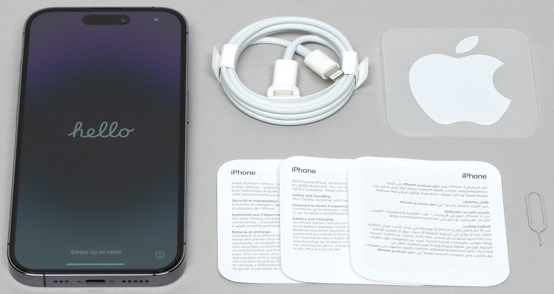 Упаковка и комплектация iPhone 14 Pro идентична предшественникам. Смартфон поставляется в компактной коробке без пленки, но с защитной бумажной лентой, которую надо разорвать.