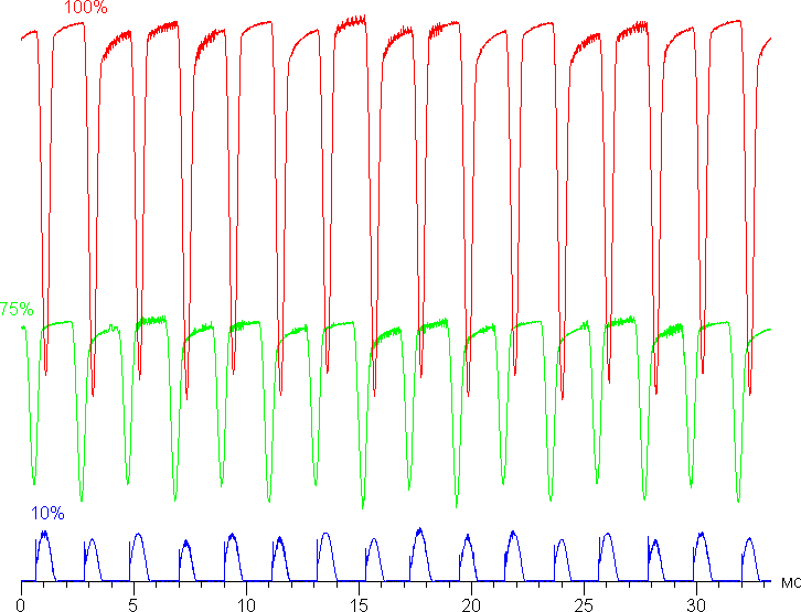 Видно, что на максимальной и средней яркости амплитуда модуляции не очень большая (точнее скважность явно низкая), в итоге видимого мерцания нет. Однако при сильном понижении яркости появляется модуляция с большой относительной амплитудой (и высокой скважностью), ее наличие уже можно увидеть в тесте на присутствие стробоскопического эффекта или просто при быстром движении глаз. В зависимости от индивидуальной чувствительности такое мерцание может вызывать повышенную утомляемость. Впрочем, частота довольно высокая и фаза модуляции различается по площади экрана, поэтому негативный эффект от мерцания снижен.