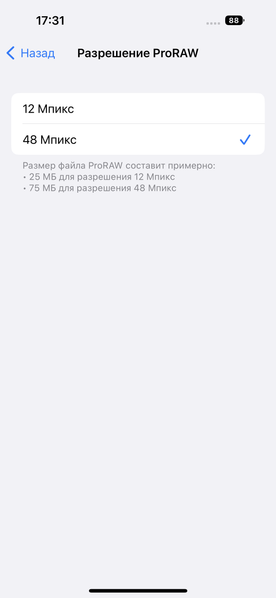 Во-первых, придется зайти в Настройки / Камера / Форматы и передвинуть рычажок напротив Apple ProRAW в активное положение, тем самым активировав возможность съемки в несжатом формате. Во-вторых, далее надо заглянуть в меню «Разрешение ProRAW» и поставить галочку напротив значения 48 Мп.