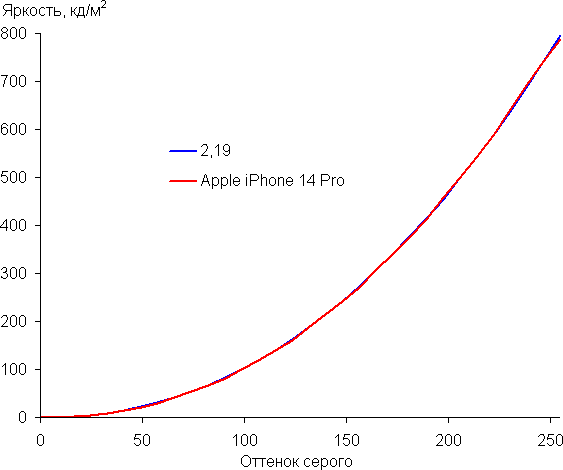 Видно, что в этом случае есть небольшое перекрестное подмешивание компонент, то есть родное для экрана Apple iPhone 14 Pro цветовое пространство чуть шире, чем Display P3.