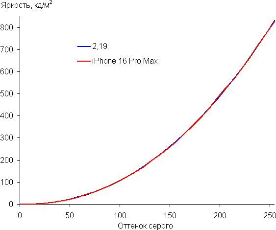 Построенная по 32 точкам с равным интервалом по численному значению оттенка серого гамма-кривая не выявила завала ни в светах, ни в тенях. Показатель аппроксимирующей степенной функции равен 2,21/2,19, что очень близко к стандартному значению 2,2. При этом реальная гамма-кривая мало отклоняется от степенной зависимости: