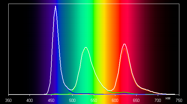 Такие спектры типичны для матриц OLED — компоненты хорошо разделены, что позволяет достигнуть широкого цветового охвата. Однако в данном случае цветовой охват аккуратно корректируется до границ sRGB. В итоге визуально цвета имеют естественную насыщенность.