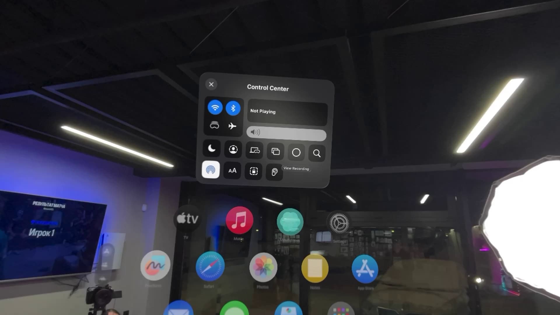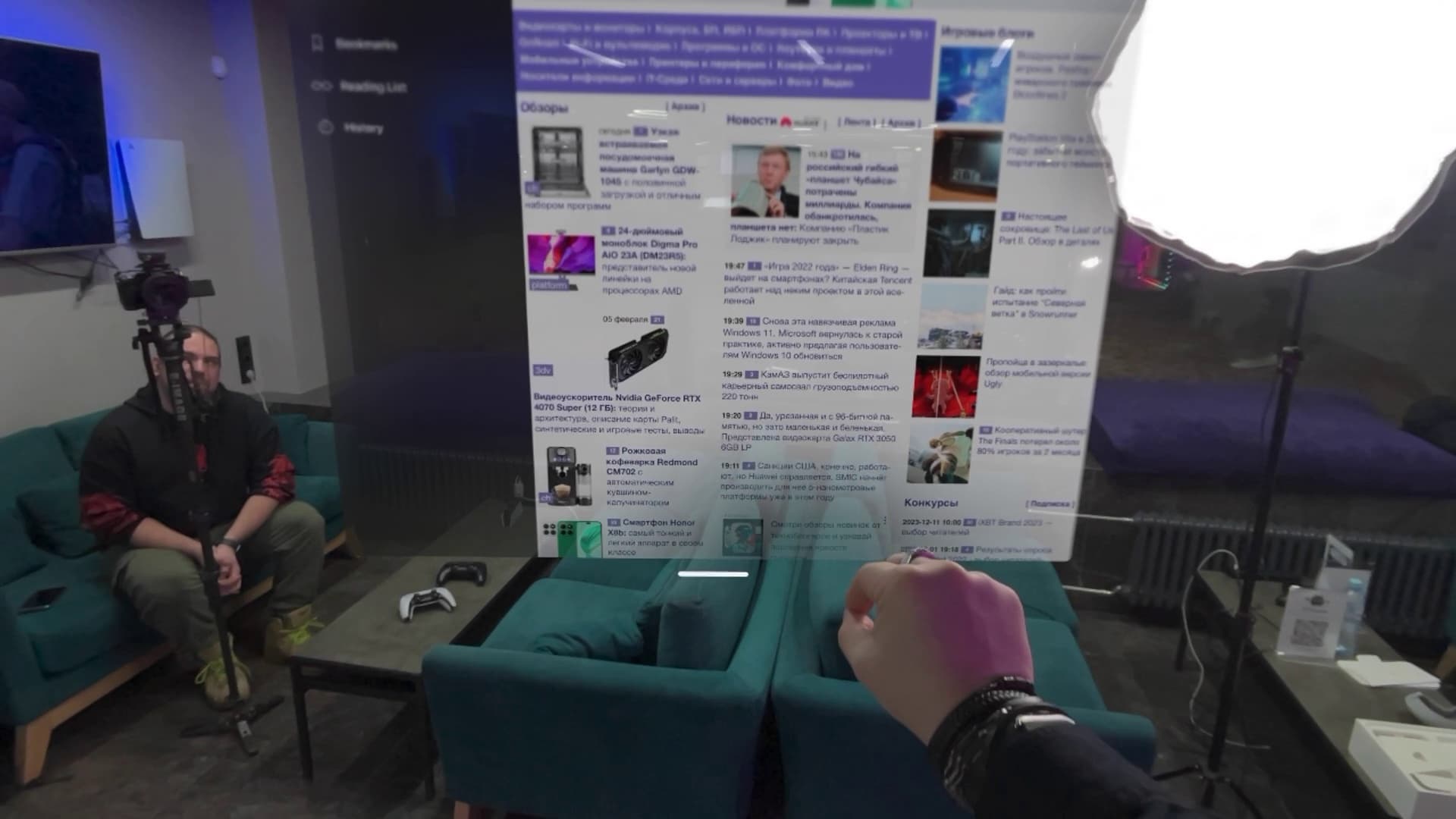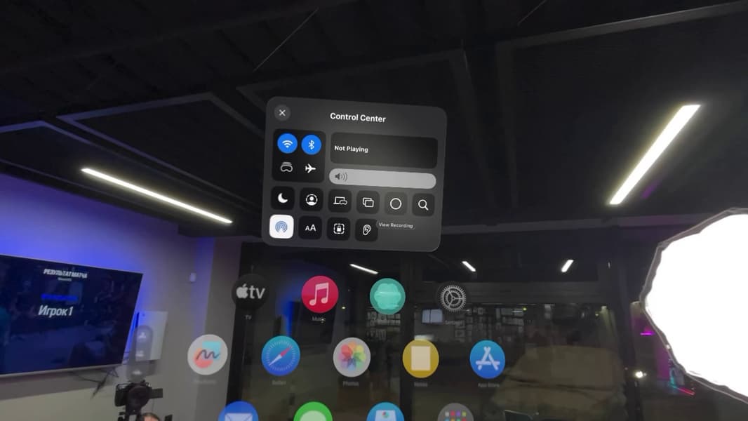 Самая важная часть Vision Pro — это собственно передняя часть, со стеклами. Здесь расположены датчики, дисплеи с разрешением 4К на каждый глаз, а также камеры, которые фиксируют окружающую реальность и транслируют ее внутрь Vision Pro. На скриншоте ниже видно, как виртуальные меню соседствуют с объектами настоящего мира.