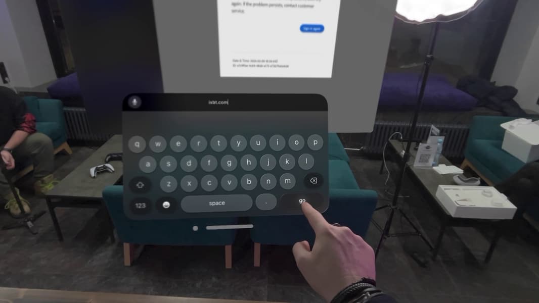 Так можно расположить множество окон в пространстве, то есть теоретически Vision Pro может заменить несколько мониторов, например у программиста или дизайнера. И да, вы без проблем можете подключить к гарнитуре беспроводную клавиатуру и работать с текстом. А можете воспользоваться виртуальной клавиатурой, набирать на которой надо просто пальцами в воздухе (точнее, одним пальцем — указательным). Разумеется, этот вариант уже непригоден для написания развернутых предложений, но, например, кратко ответить на сообщение или набрать адрес сайта — почему бы и нет.