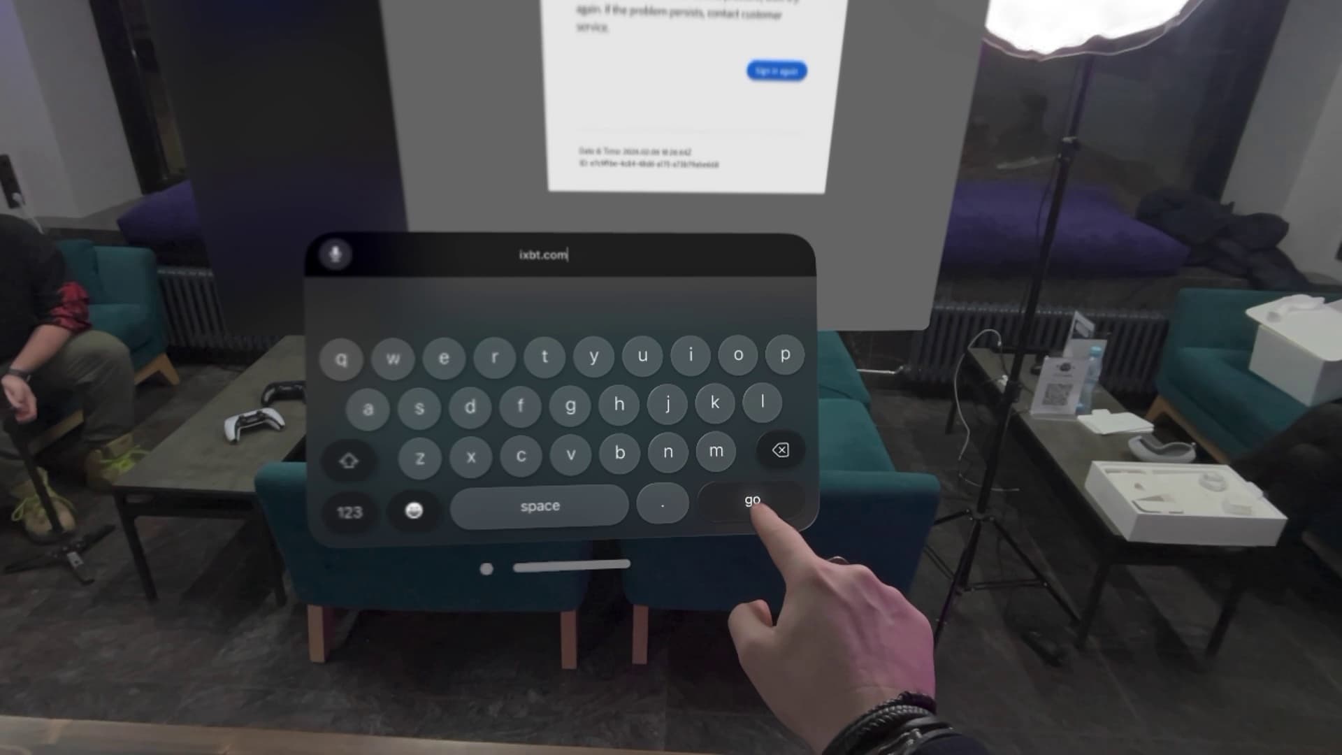Открыв любое из приложений, мы увидим окно, которое занимает не весь экран, а лишь его часть. И самое интересное, что опять-таки с помощью пальцев мы можем увеличить это окно до желаемого размера, переместить его куда угодно, расположить под углом и так далее. На скриншоте ниже окно браузера с сайтом iXBT.com, естественно, виртуальное, а вот рука — реальная.