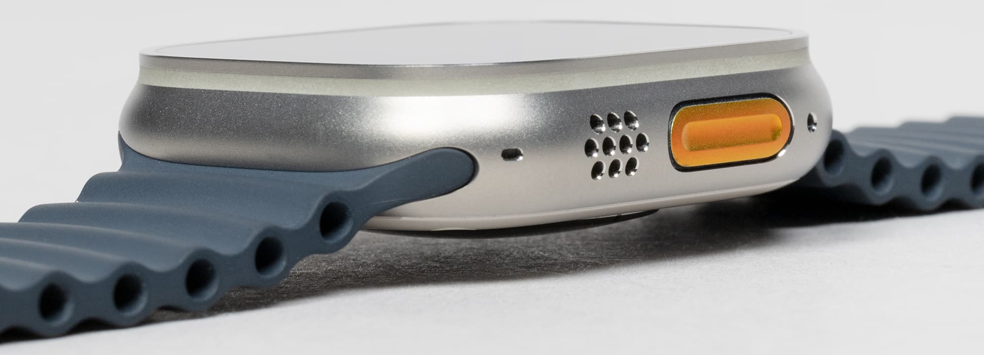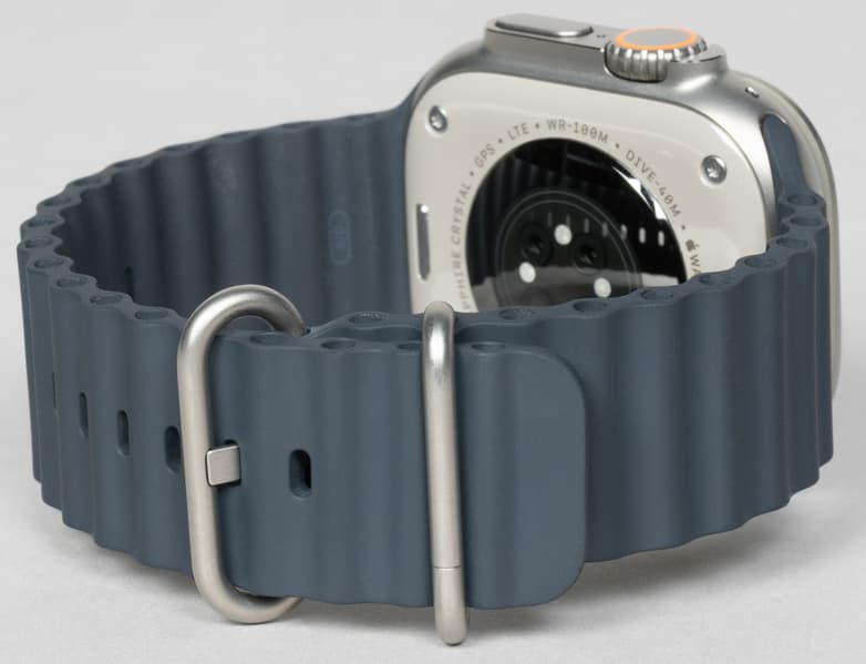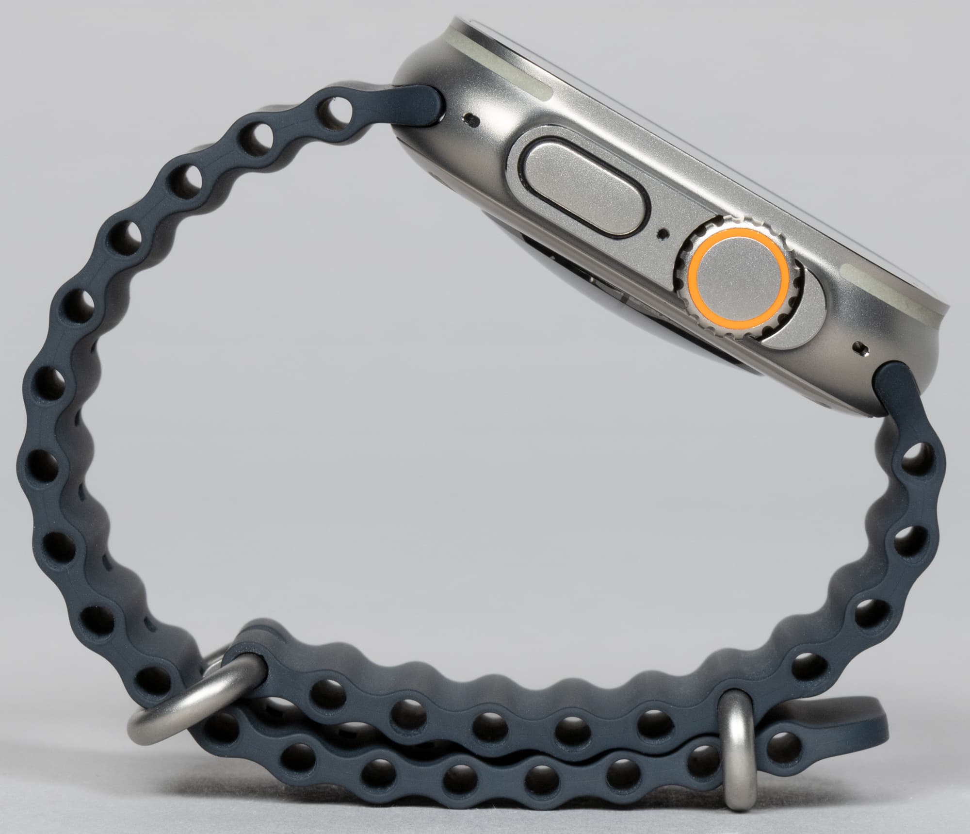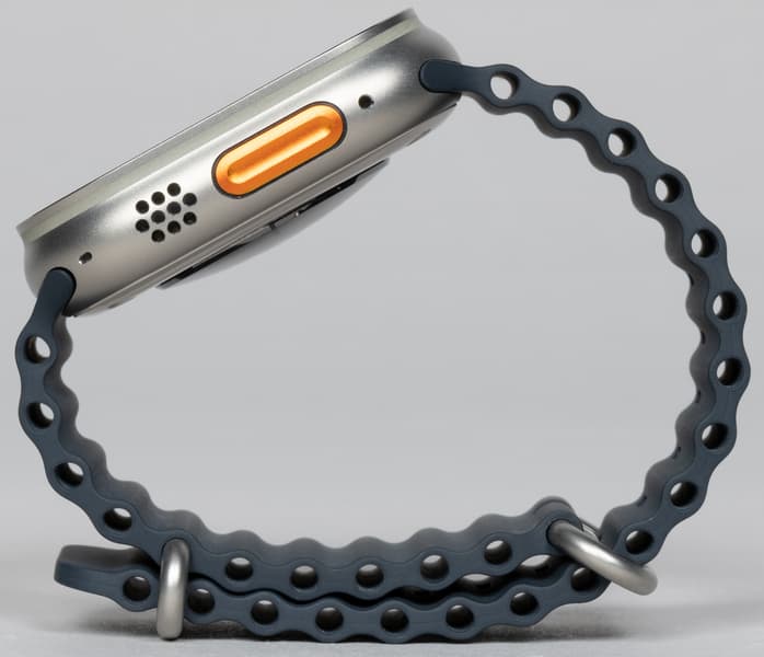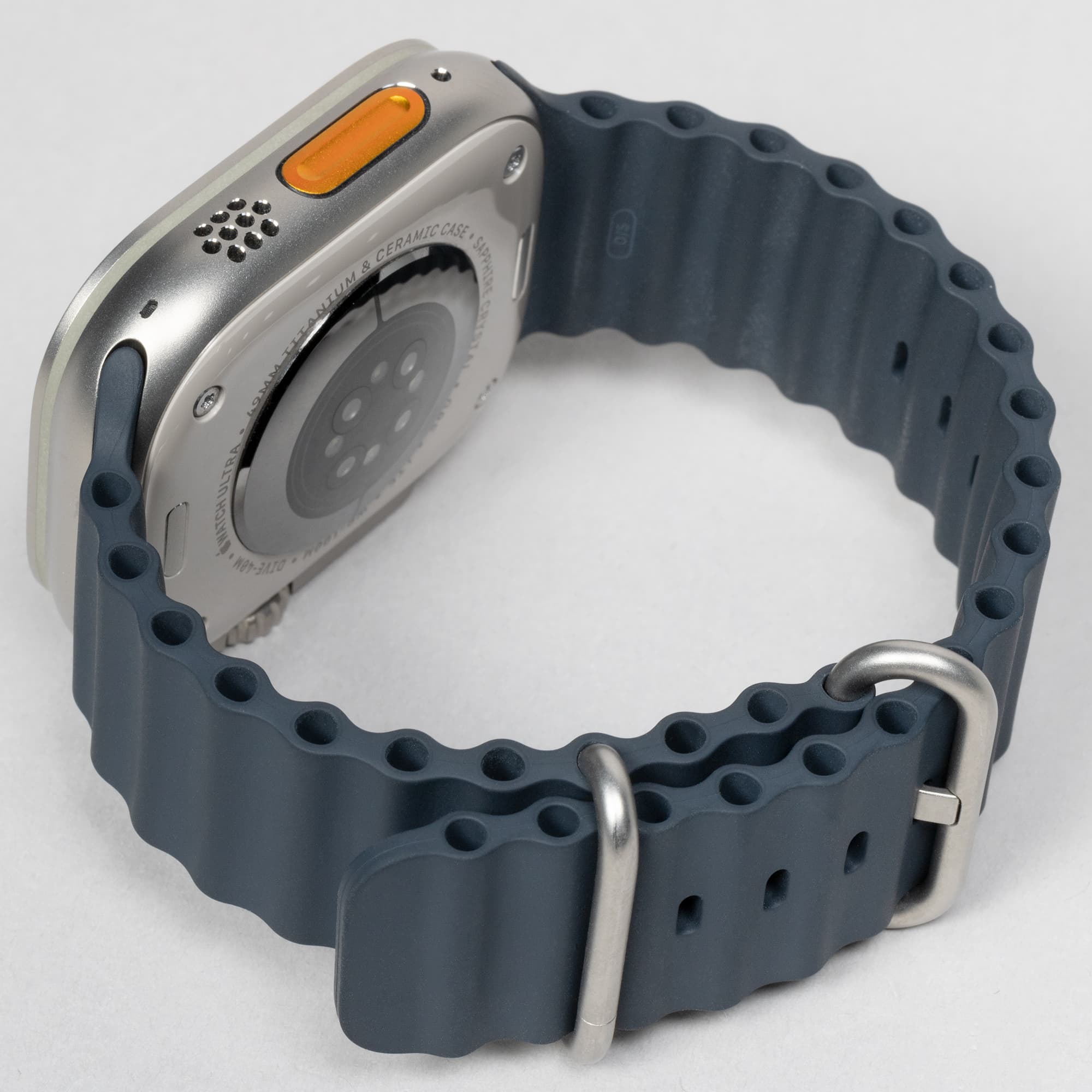 Наконец, нельзя не сказать и о новых ремешках. Специально для Watch Ultra компания Apple выпустила три варианта в трех цветах каждый: Alpine Loop из полиэстера (зеленый, оранжевый и светло-серый), нейлоновый Trail Loop (сине-серый, черно-серый и желто-бежевый) и, наконец, силиконовый, точнее флуоэластомерный, Ocean Band (белый, темно-синий и желтый). Модель, приехавшая к нам тестирование, комплектовалась темно-синим Ocean Band.