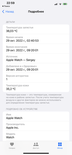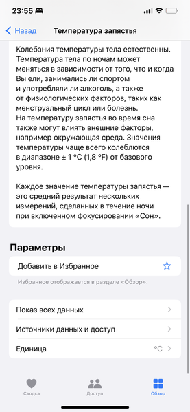 Температурный датчик используется и во время сна, но интересно, что выводы на основе его показаний устройство готово делать лишь через пять дней использования. Сами же данные тщательно спрятаны, хотя при желании их можно откопать: в приложении «Здоровье» надо нажать на «Измерения тела» / «Требуются дополнительные измерения», промотать вниз, нажать «Показ всех данных» и выбрать пункт, соответствующий нужному времени.