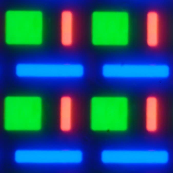 В этом экране используется матрица AMOLED — активная матрица на органических светодиодах. Полноцветное изображение создается с помощью субпикселей трех цветов — красного (R), зеленого (G) и синего (B) в равном количестве, что подтверждается фрагментом микрофотографии: