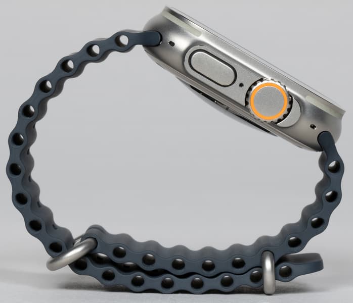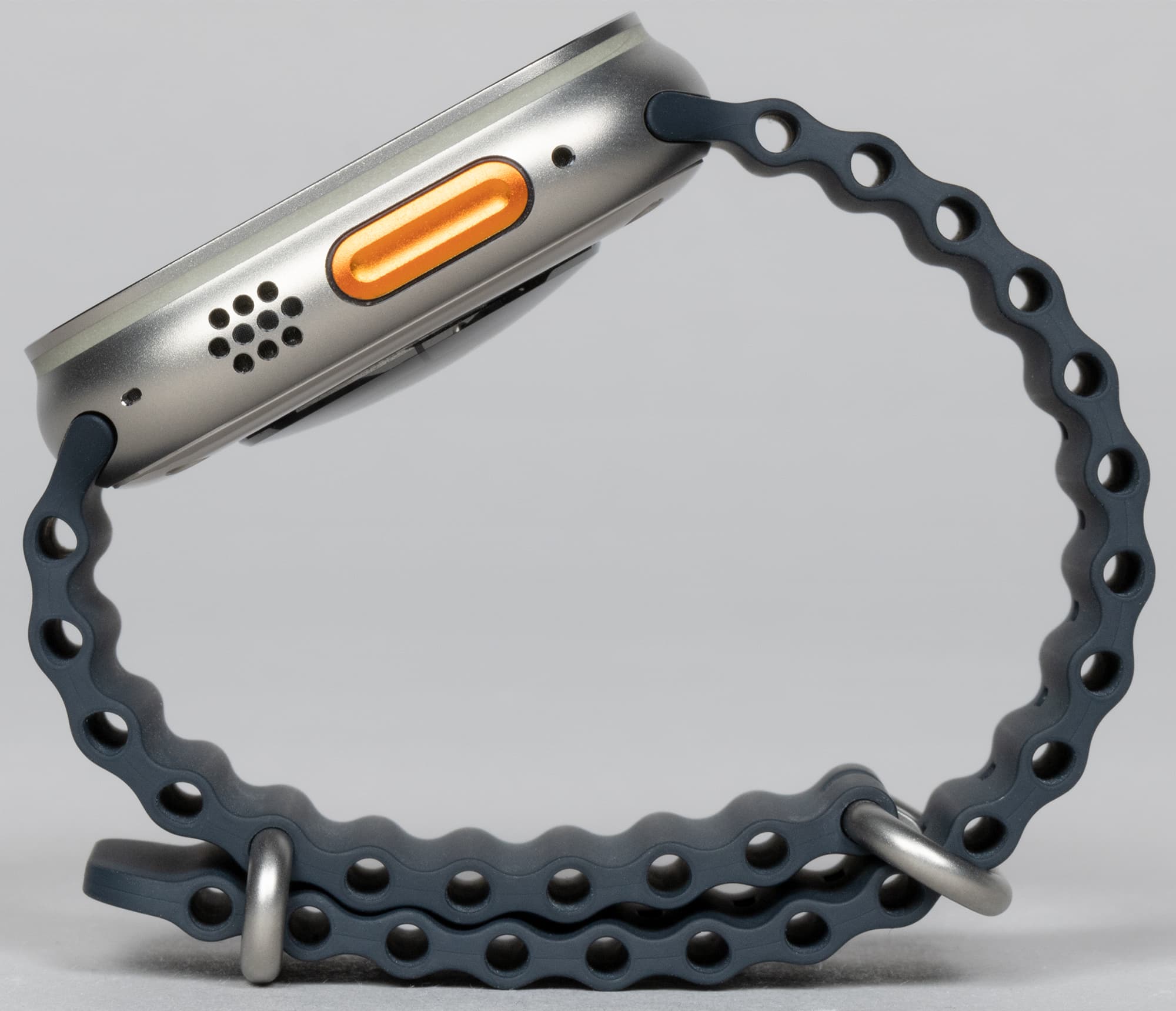 Кстати, не все, кому мы показывали Apple Watch Ultra, согласились с нашей оценкой ремешка. Было мнение, что как раз такое решение оптимально: рука меньше потеет под силиконом благодаря бороздкам, а сквозные отверстия позволяют сделать ремешок более гибким и легким.