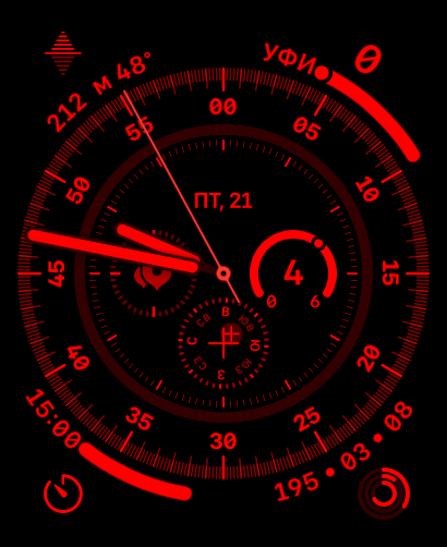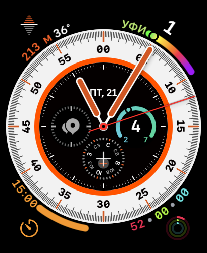 Ну и отметим новый циферблат, созданный специально для Apple Watch Ultra и установленный по умолчанию. Он, как видите, тоже основан на компасе и соединяет информативность (мы бы даже сказали, перегруженность) с эффектностью.
