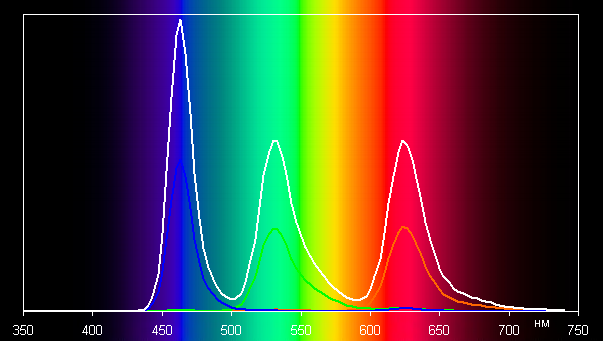 Спектры типичны для OLED — области первичных цветов хорошо разделены и имеют вид относительно узких пиков, перекрестное подмешивание цветов небольшое: