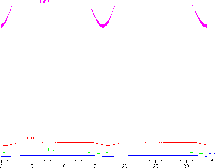 Автоматическая регулировка яркости по датчику освещенности работает всегда. Пользователь может только вносить коррективы в работу этой функции, выбирая один из трех уровней. На любом уровне яркости есть модуляция с частотой 60 Гц, но амплитуда ее небольшая (точнее, может быть и большая, но скважность низкая), поэтому мерцания не видно. Графики зависимости яркости (вертикальная ось) от времени (горизонтальная ось) иллюстрируют изложенное выше (четыре уровня яркости):