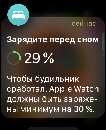 И вот еще нюанс: перед сном часы сообщают, что их надо зарядить, если осталось меньше 30%. Не совсем понятно, зачем это делается, ведь на ночь хватает даже 15%, но иначе будильник, установленный на часах, не сработает.