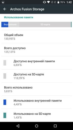 Но это еще не все. Самое необычное, что можно найти среди настроек Archos Diamond Plus — это функция интеграции памяти устанавливаемой карты microSD с внутренней памятью устройства так, что они становятся единым массивом. Такая функция носит название Archos Fusion Storage, и она здесь действительно работает. Причем, вопреки официальным предупреждениям о поддерживаемом максимальном объеме SD-карт до 32 ГБ, на деле аппарат без проблем поддерживает карты и объемом в 128 ГБ. При установке карты памяти смартфон самостоятельно перезагружается и после этого показывает в настройках уже «суммарный» объем памяти. В нашем случае получилось целых 130 ГБ, хотя собственной свободной памяти в устройстве изначально не более 8 ГБ.