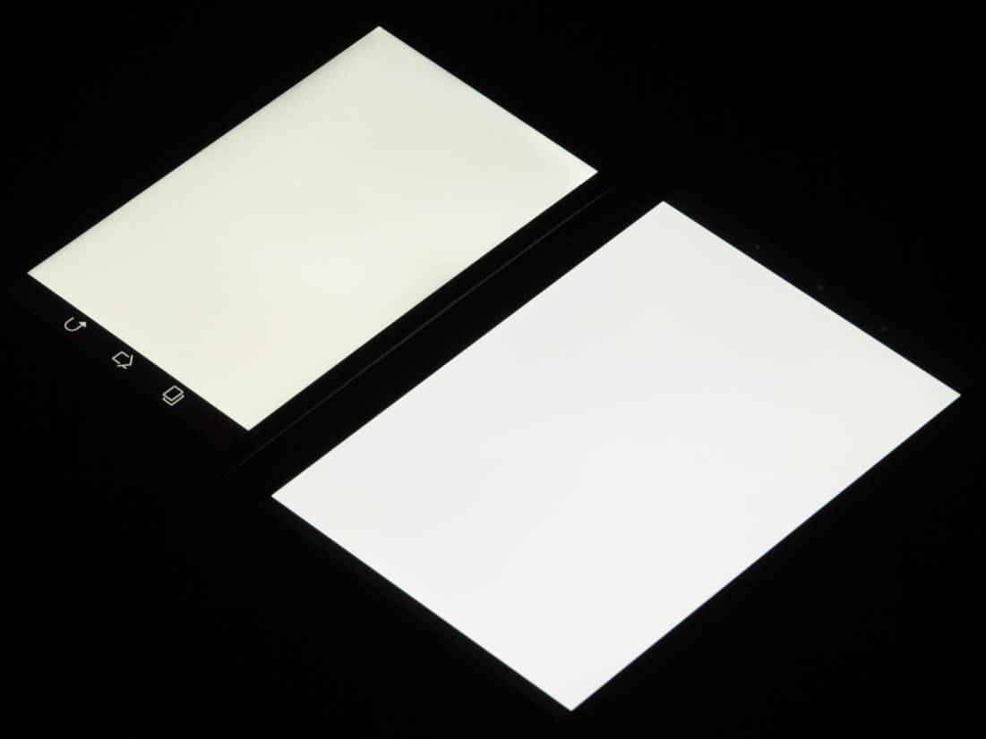 Черное поле при отклонении по диагонали высветляется совсем немного и приобретает красно-фиолетовый оттенок или остается практически нейтрально серым. Фотография с Nexus 7 для сравнения это показывает (яркость белых участков у обоих экранов одинаковая!):