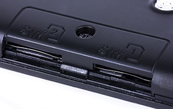 Под крышкой можно найти три слота для карточек: два для SIM-карт и один для карты памяти формата microSD. Обе SIM-карты здесь используются формата «Micro»; все карточки легко вставляются и извлекаются из своих слотов за счет подпружиненных механизмов захвата. Слоты для SIM-карт равнозначны по своим возможностям, необходимо лишь помнить, что одновременно две карты не будут работать в режиме 3G — одну из них придется переключить в 2G. Для перераспределения ролей нет необходимости физически менять SIM-карты в слотах — переназначить режимы работы можно через программное меню настроек.