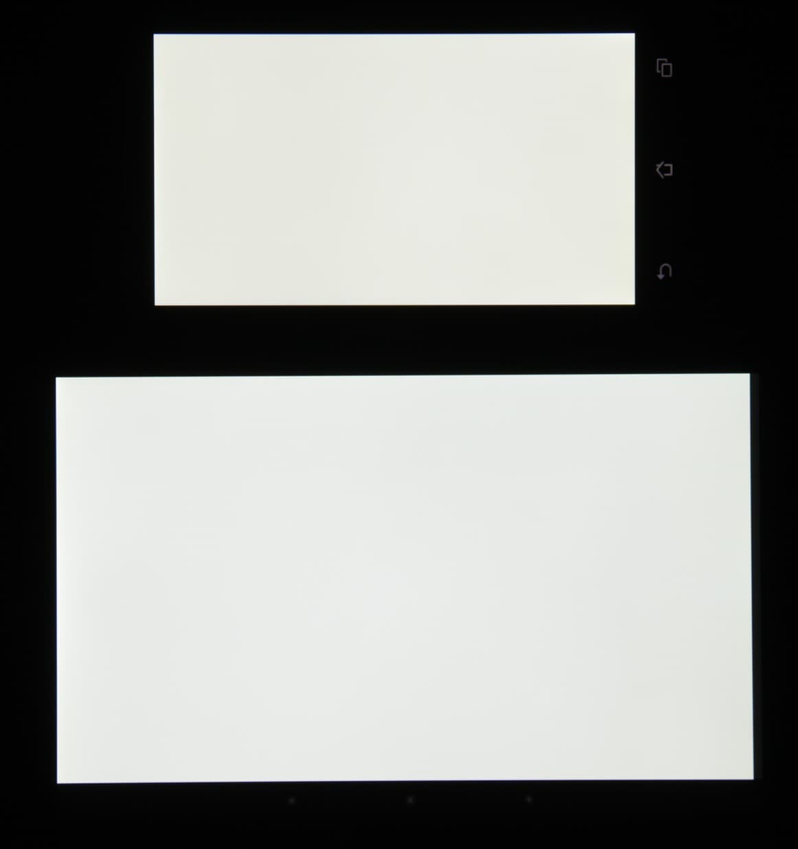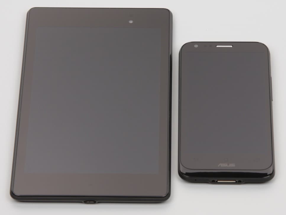 Лицевая поверхность экрана выполнена в виде стеклянной пластины с зеркально-гладкой поверхностью, устойчивой к появлению царапин. Судя по отражению объектов антибликовые свойства экрана не хуже, чем у экрана Google Nexus 7 (2013) (далее просто Nexus 7). Для наглядности приведем фотографию, на которой в выключенных экранах отражается белая поверхность (слева — Nexus 7, справа — Asus PadFone E, далее их можно различать по размеру):