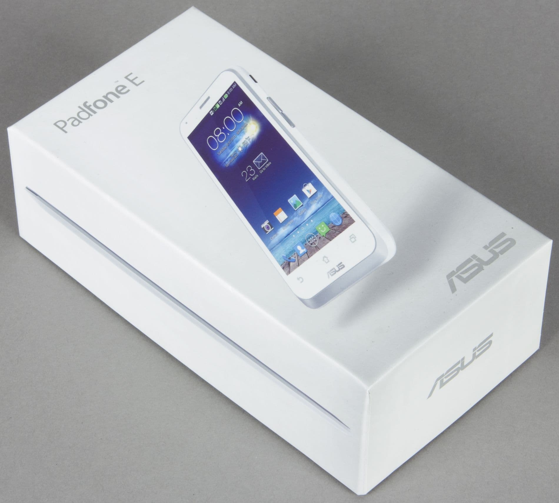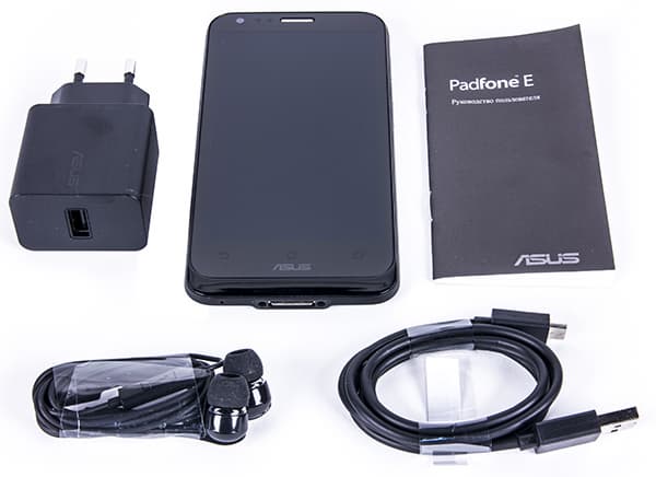 В отличие от своих «полноценных» собратьев по линейке, Asus Padfone Е поступает в продажу в небольшой упаковке классических габаритов, достаточных для вмещения одного лишь смартфона и небольшого комплекта необходимых аксессуаров. Выполнена коробка из твердого картона, обклеенного белой бумагой, упаковка аккуратная и качественная.