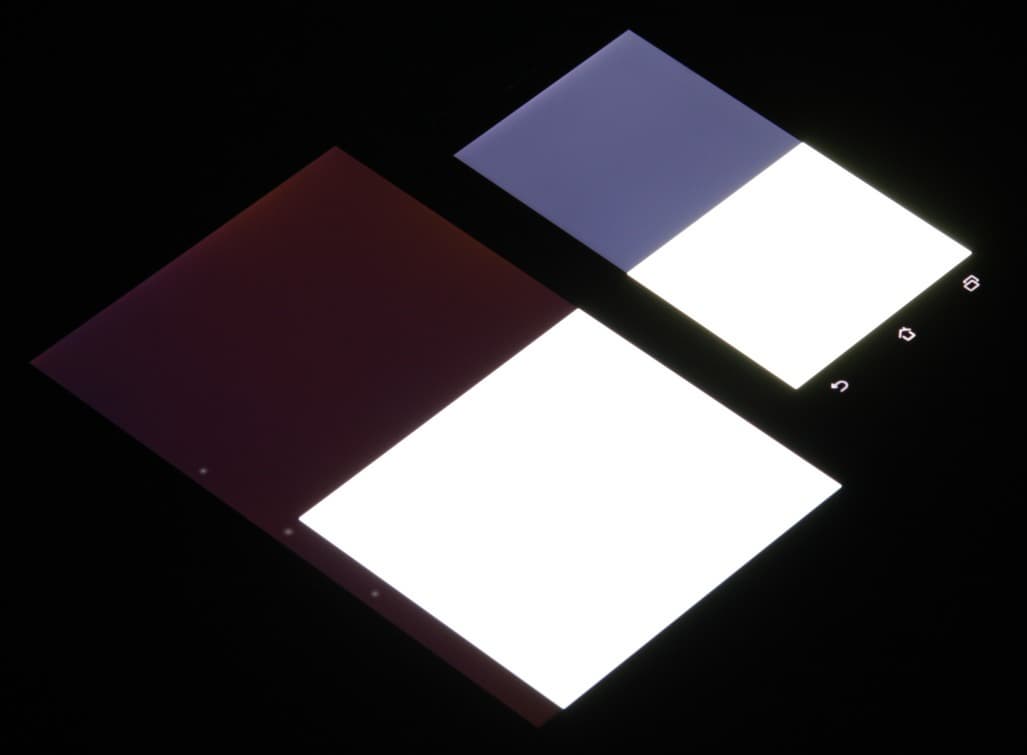 Экран имеет хорошие углы обзора без значительного сдвига цветов даже при больших отклонениях взгляда от перпендикуляра к экрану и без инвертирования оттенков. Для сравнения приведем фотографии, на которых на экраны Asus PadFone E и Nexus 7 выведены одинаковые изображения, при этом яркость экранов изначально установлена примерно на 200 кд/м² (по белому полю во весь экран), а цветовой баланс на фотоаппарате принудительно переключен на 6500 К. Перпендикулярно к экранам белое поле: