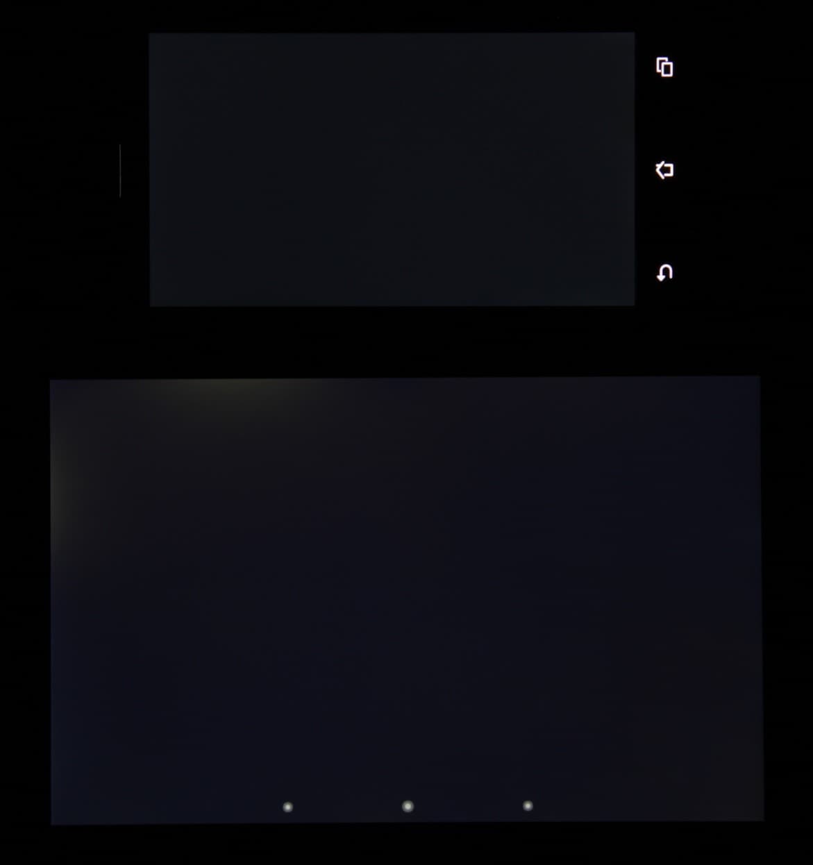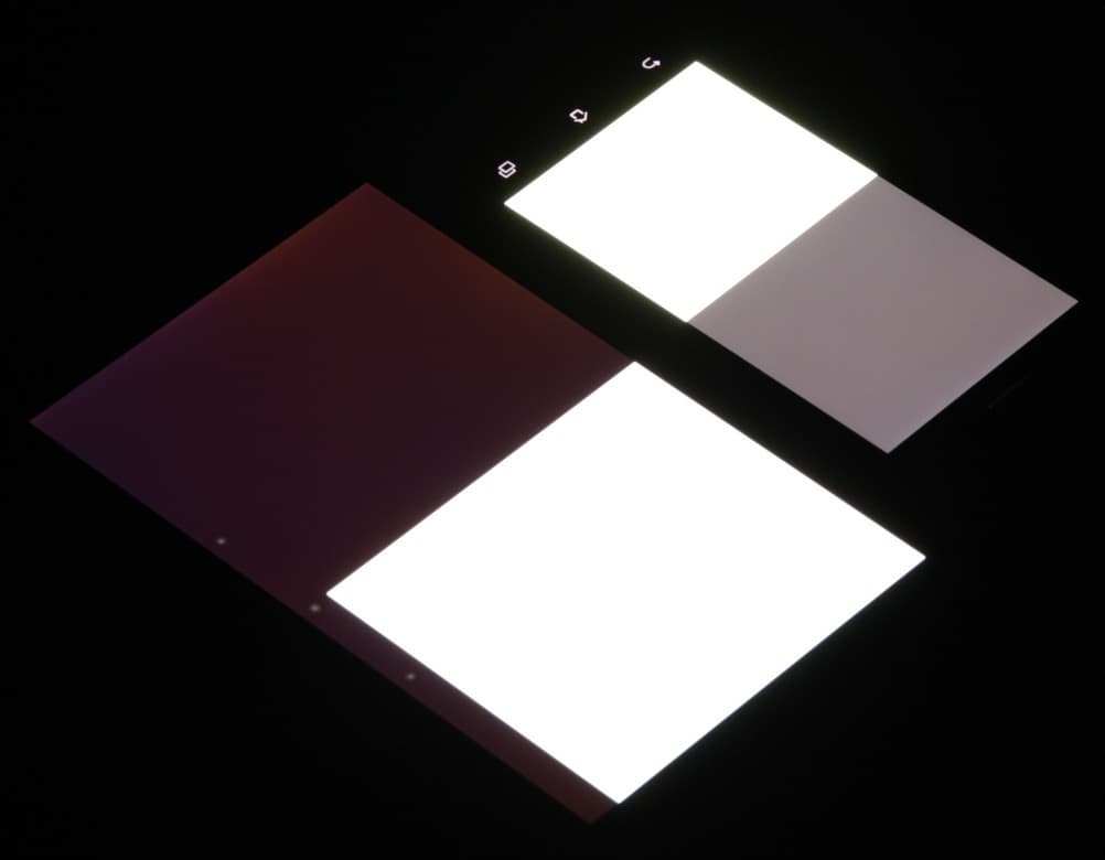 Яркость под углом у экранов уменьшилась (как минимум в 4 раза, исходя из разницы в выдержке), но у Asus PadFone E экран все же светлее (усредненная яркость по фотографиям 234 против 217 у Nexus 7). Черное поле при отклонении по диагонали высветляется сильно и приобретает фиолетовый или красно-фиолетовый оттенок. Фотографии ниже это демонстрируют (яркость белых участков в перпендикулярном плоскости экранов направлении примерно одинаковая!):