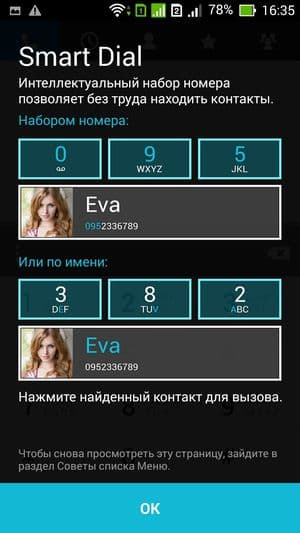 Прорисовка букв и цифр виртуальных клавиатур вполне комфортна для управления. Раскладка и расположение клавиш стандартное: переключение языков здесь осуществляется нажатием на специальную кнопку с изображением глобуса, также в наличии выделенный ряд с цифрами — очень удобно, нет необходимости каждый раз переключать раскладку. Телефонное приложение поддерживает Smart Dial, то есть во время набора телефонного номера сразу осуществляется и поиск по первым буквам в контактах. Имеется и возможность написания безотрывным методом скольжения пальца от кнопки к кнопке (Swype).
