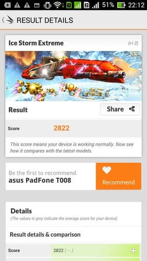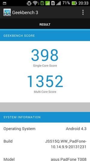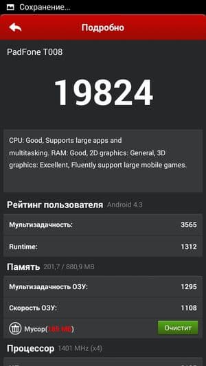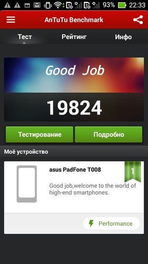 В целом, по результатам всех тестирований смартфон Asus Padfone Е можно смело отнести к разряду аппаратов со средней (даже чуть выше среднего) производительностью. На данный момент аппаратной производительности данного смартфона должно хватать для выполнения большинства задач, которые могут поставить любые игры или другие приложения из Google Play Store.