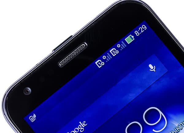 На лицевой поверхности почти вся передняя панель прикрыта плоским защитным стеклом без бортиков, в нем вырезано отверстие для крупной блестящей хромированной решетки слухового динамика, рядом виднеются глазки фронтальной камеры и сенсоров.