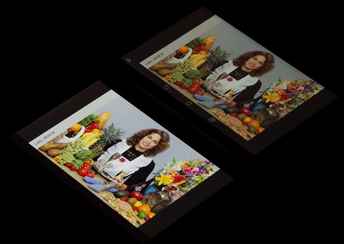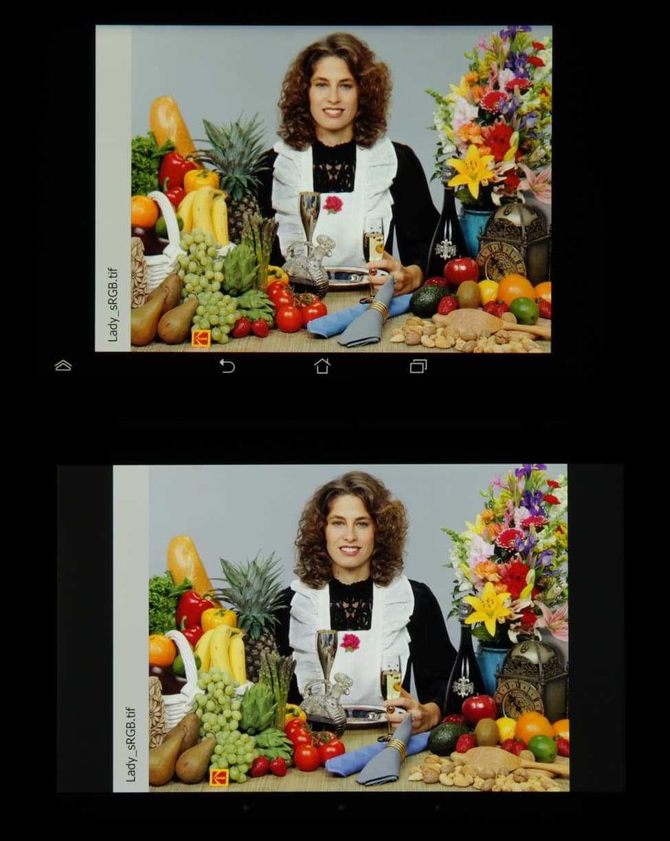 Экран имеет хорошие углы обзора без инвертирования оттенков и без значительного сдвига цветов даже при больших отклонениях взгляда от перпендикуляра к экрану. Для сравнения приведем фотографии, на которых на экраны Nexus 7 и тестируемого планшета выведены одинаковые изображения, при этом яркость обоих экранов установлена примерно на 200 кд/м² (экранные кнопочки иконками — на экране док-станции). Перпендикулярно к экранам тестовая картинка:
