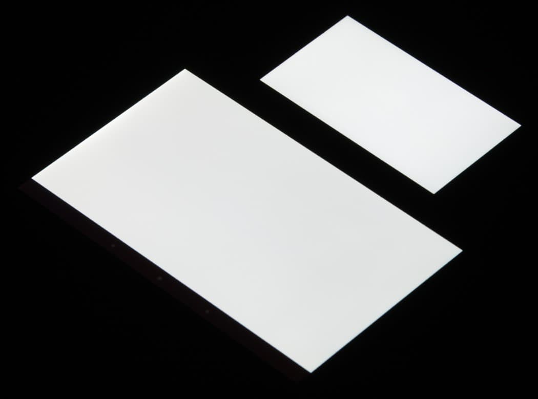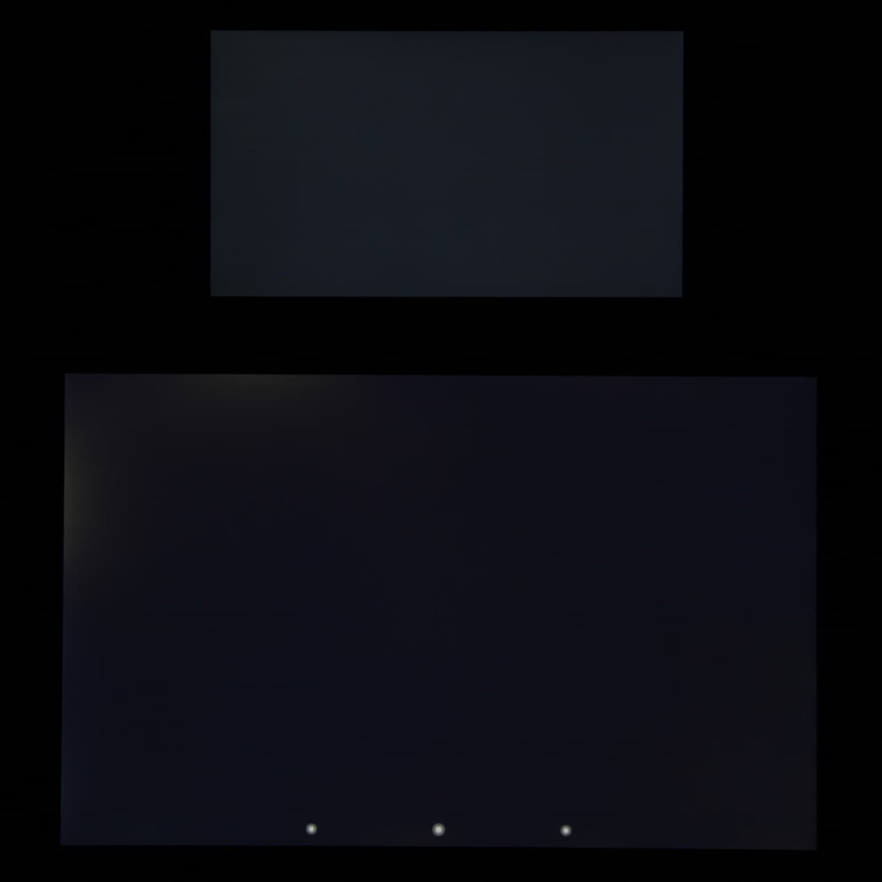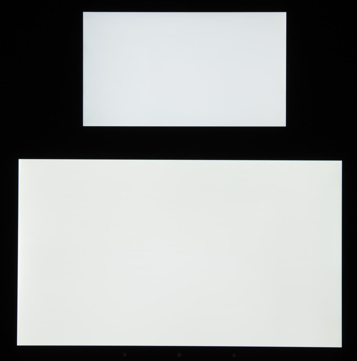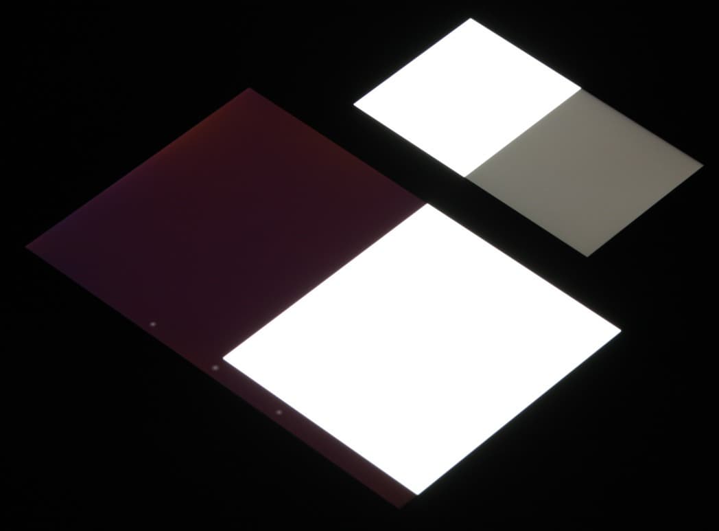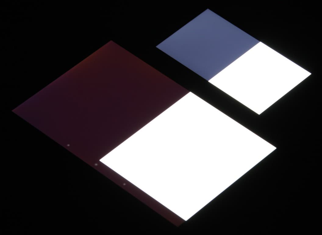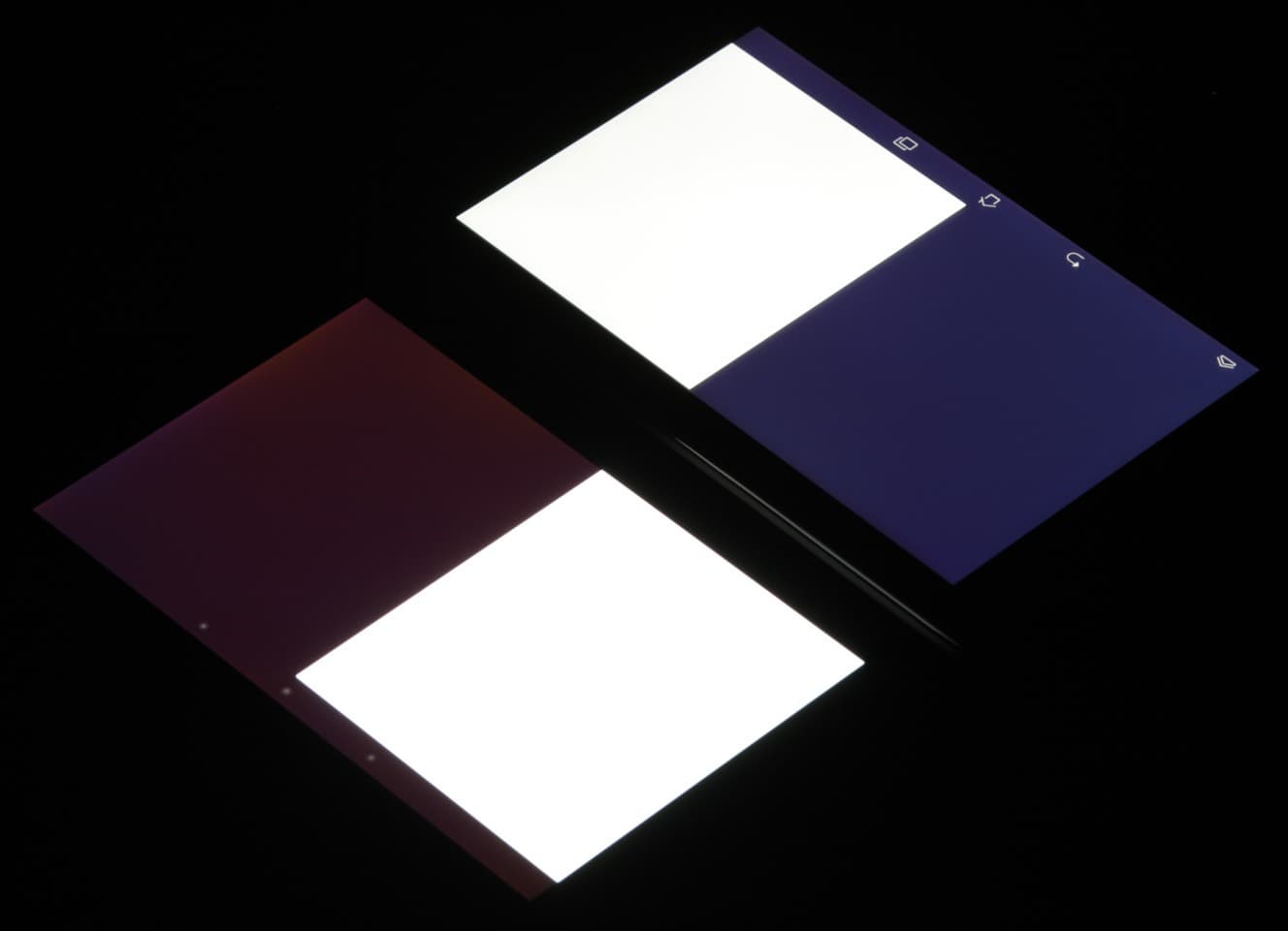 Яркость под углом у экранов уменьшилась (как минимум в 5 раз, исходя из разницы в выдержке), но в случае смартфона яркость под этим углом все же немного выше. Черное поле при отклонении по диагонали сильно высветляется и приобретает фиолетовый оттенок или остается почти нейтрально серым. Фотографии ниже это демонстрируют (яркость белых участков в перпендикулярном плоскости экранов направлении у экранов одинаковая!):