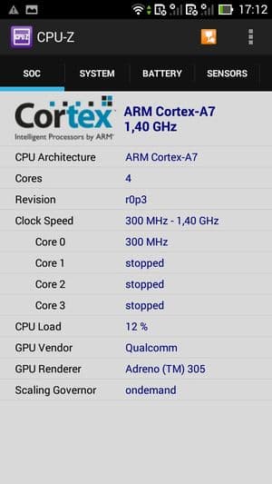 - SoC Qualcomm Snapdragon 400 (MSM8226), 1,4 ГГц, 4 ядра ARM Cortex-A7