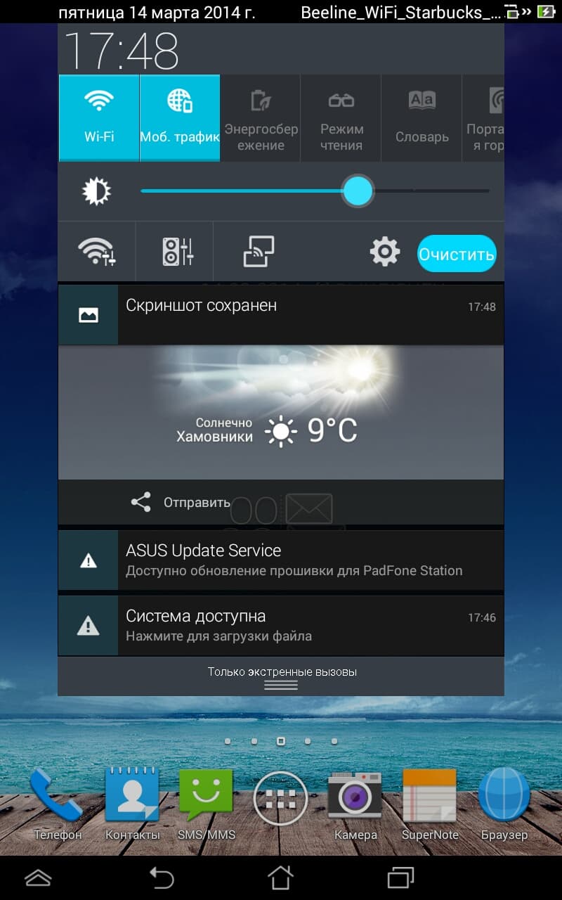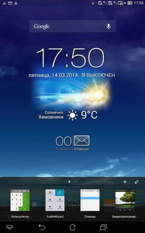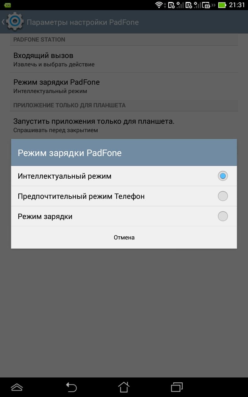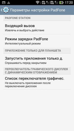 Кроме того, в настройки добавлен специальный раздел индивидуальных настроек Asus. В нем собраны все настройки параметров и режимов совместной работы смартфона и док-станции, именно он и вызывает наибольший интерес. Впрочем, как уже говорилось выше, никаких отличий от того, что мы описывали в случае Asus Padfone Infinity, здесь нет. Главный вопрос — корректность работы приложений в режимах смартфона и планшета, то есть динамический переход от небольшого экрана диагональю 4,3 дюйма к большему экрану диагональю 7 дюймов (и обратно). Большинство приложений такую резкую смену устройства вывода изображения, да еще и с другим разрешением (960×540 у смартфона и 1280×800 у планшета-станции), не поддерживают. То есть после установки смартфона в планшет-станцию (или извлечения его оттуда) приложение будет автоматически закрыто. Пользователю нужно будет запустить его заново, при этом данные в приложении, как правило, остаются в том виде, в котором были до смены экрана отображения. Однако существует и группа приложений, полноценно поддерживающих динамическую смену экрана — большинство из них написаны Asus (или специально для Asus) и предустановлены в смартфоне. К их числу относятся: FM-радио, телефон, контакты, сообщения SMS, камера, SuperNote, Polaris Office и некоторые другие.