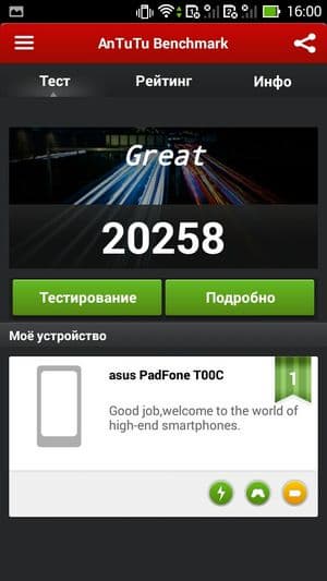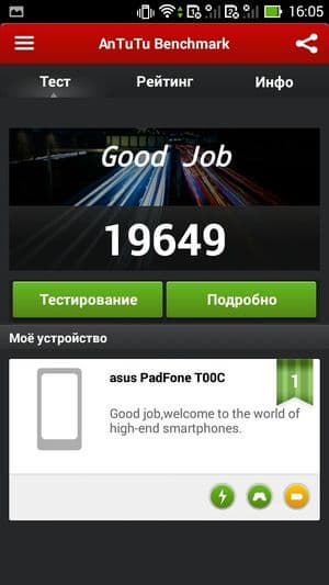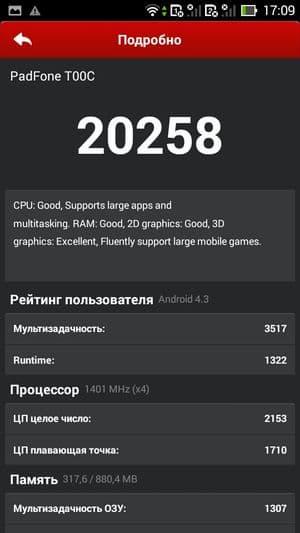 В целом, по результатам всех тестов смартфон Asus Padfone mini 4.3 можно смело отнести к разряду аппаратов со средней (даже чуть выше среднего) производительностью. На данный момент аппаратной производительности данного смартфона должно хватать для работы практически любых игр и приложений из Google Play Store.
