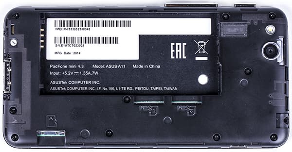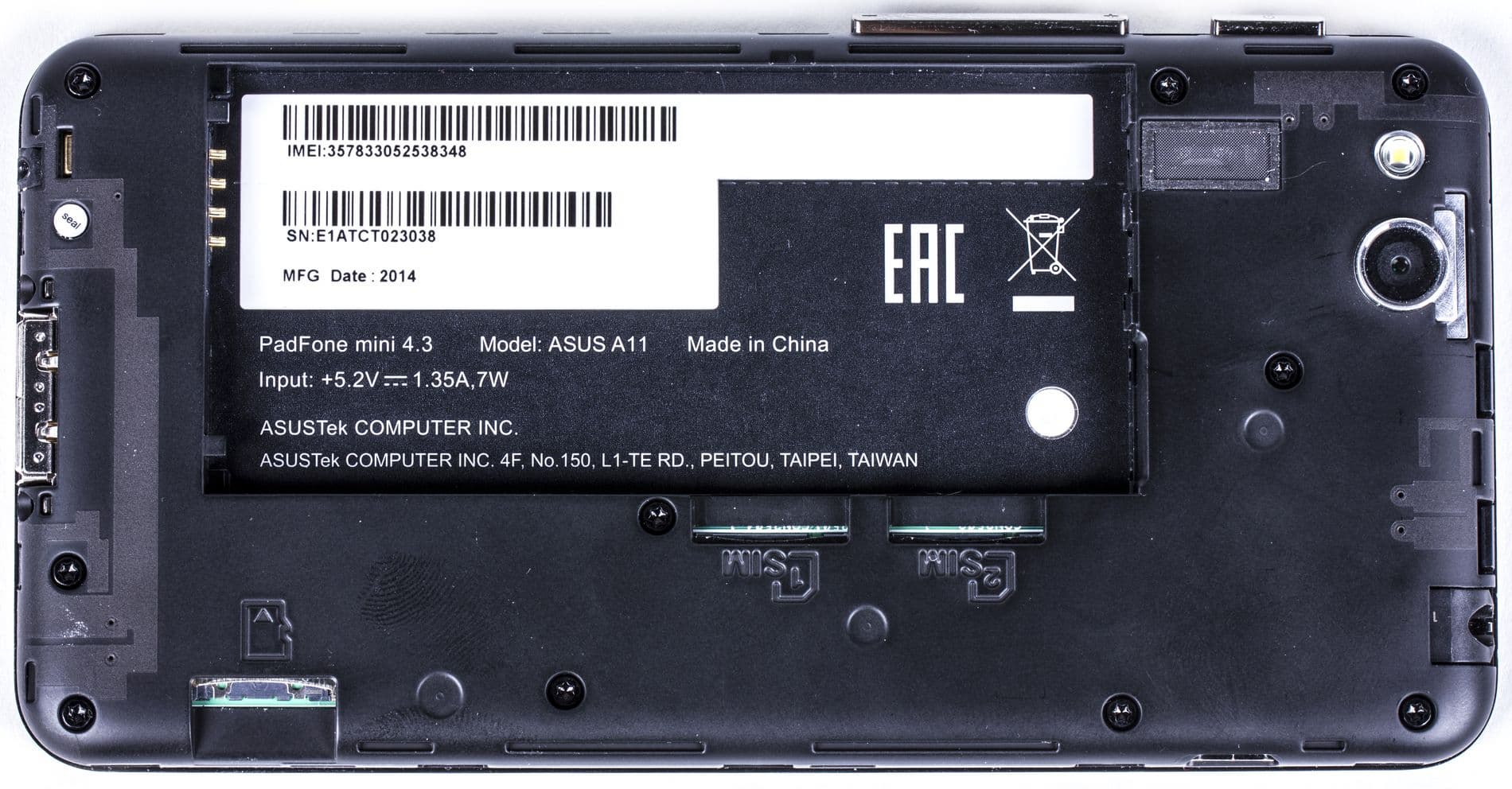 Масса — та вообще практически рекордна: смартфон Asus Padfone mini 4.3 весит всего лишь 105 г, но у этого имеется и обратная сторона медали. При такой массе и габаритах, да еще и при наличии целых трех слотов для карточек (два для SIM-карт, еще один для карты памяти), под аккумуляторную батарею в корпусе осталось совсем мало места. В итоге аппарат получил опять-таки рекордную, но уже с отрицательным знаком, емкость батареи — всего лишь 1500 мА·ч. И конечно же, это самым неблагоприятным образом сказывается на длительности автономной работы смартфона.