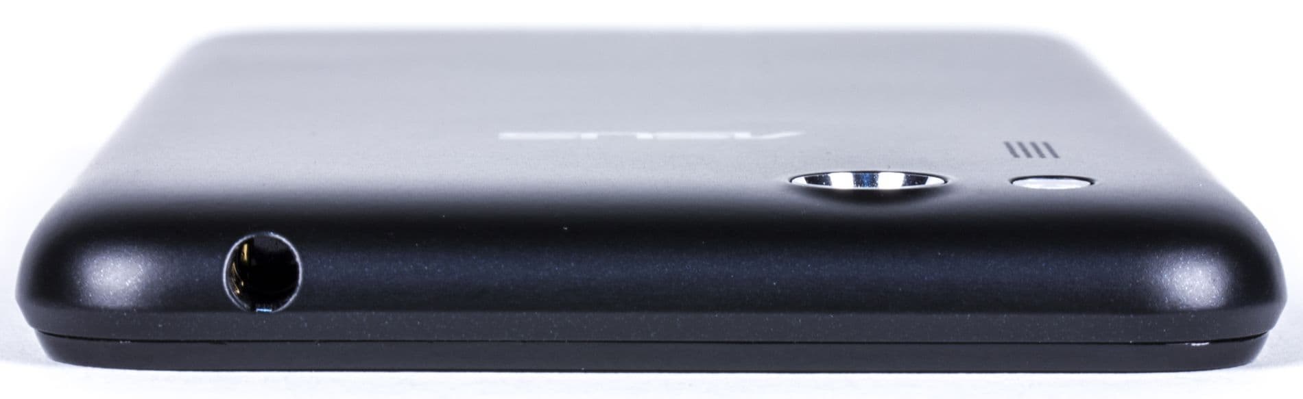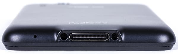 Ну а в верхней части, как и положено, разместился одинокий разъем для подключения наушников (3,5 мм). Никаких заглушек, крышечек, прикрывающих разъемы, а также петли для зацепления ремешка смартфон Asus Padfone mini 4.3 не имеет.
