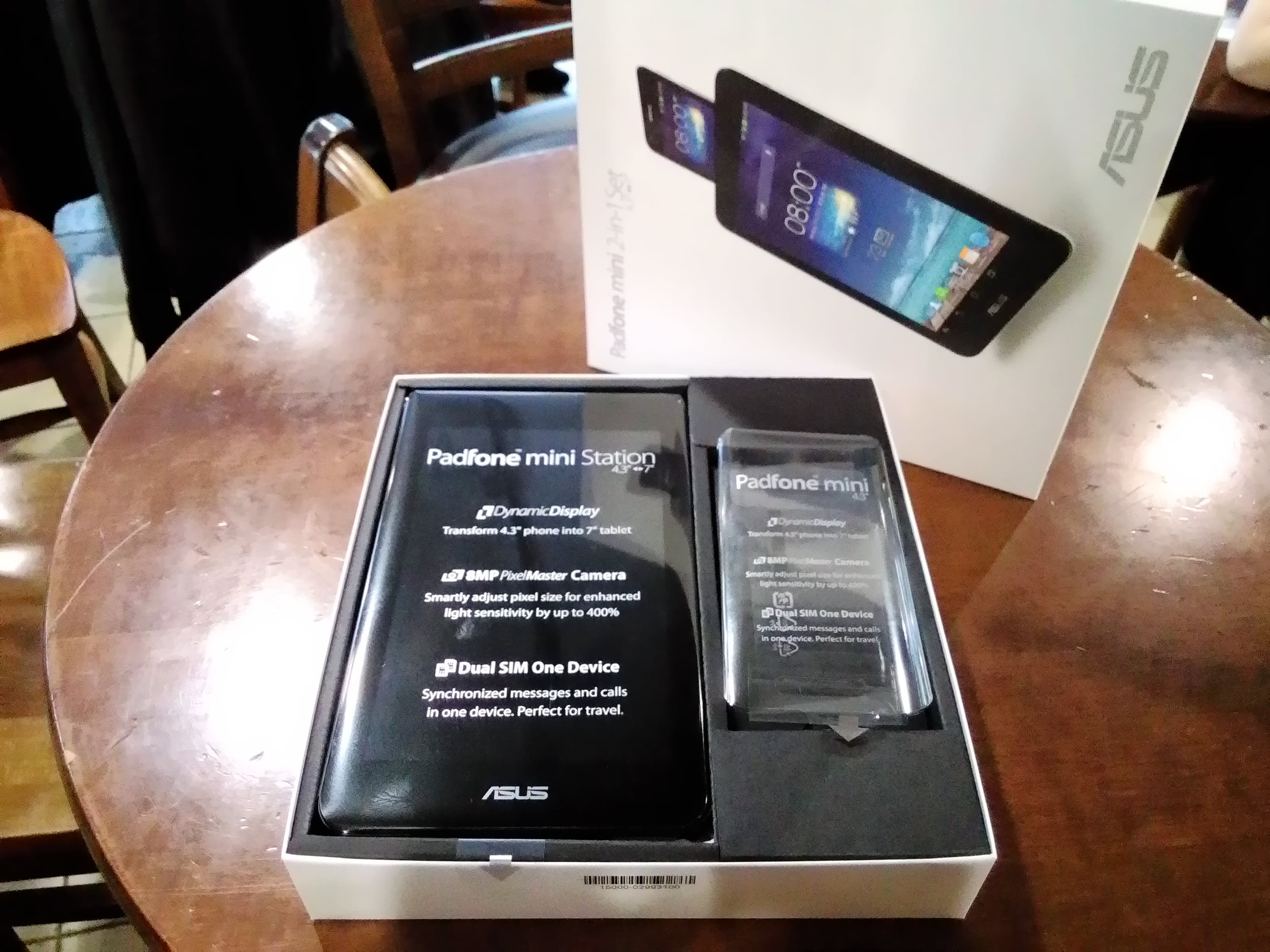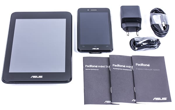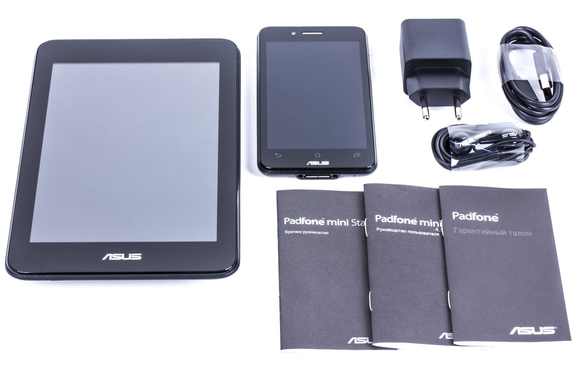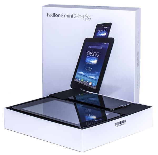 В отличие от своих «полноразмерных» собратьев по линейке, Asus Padfone mini 4.3 поступает в продажу в единой упаковке, содержащей в себе все части системы. Выполнена она в виде плоской квадратной коробки из твердого картона, обклеенного белой бумагой; внутри имеется несколько отделений различного размера под все составные части комплекта.