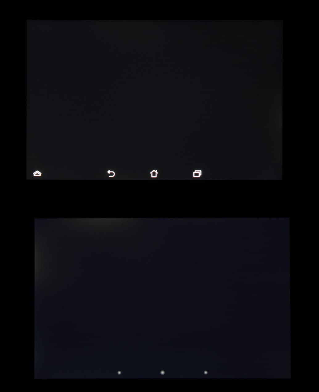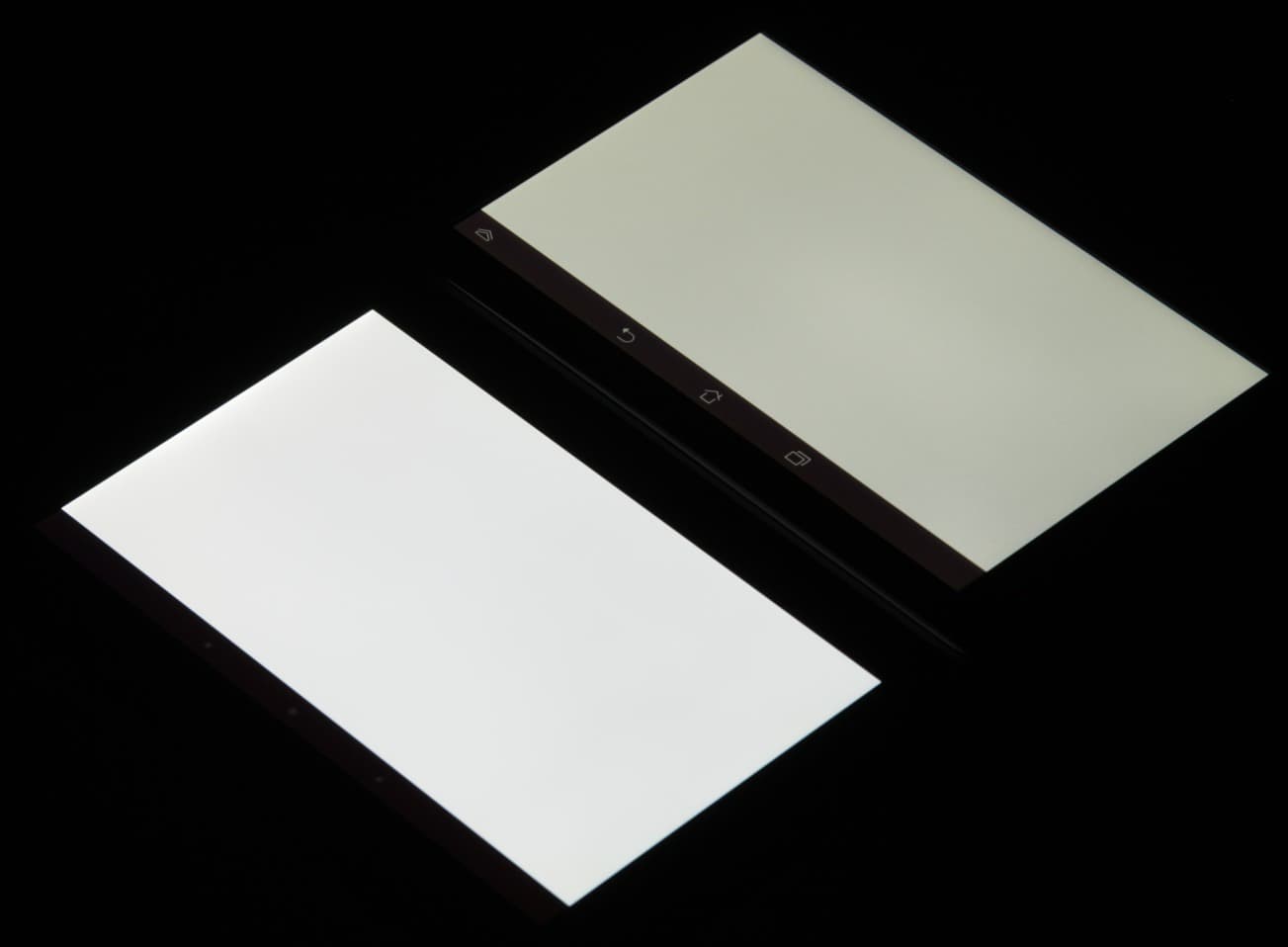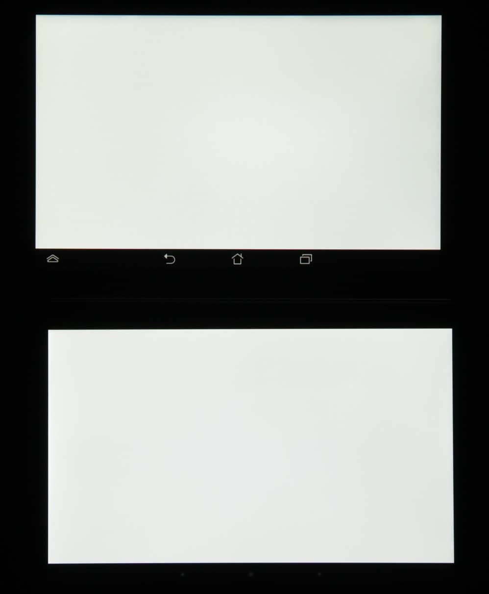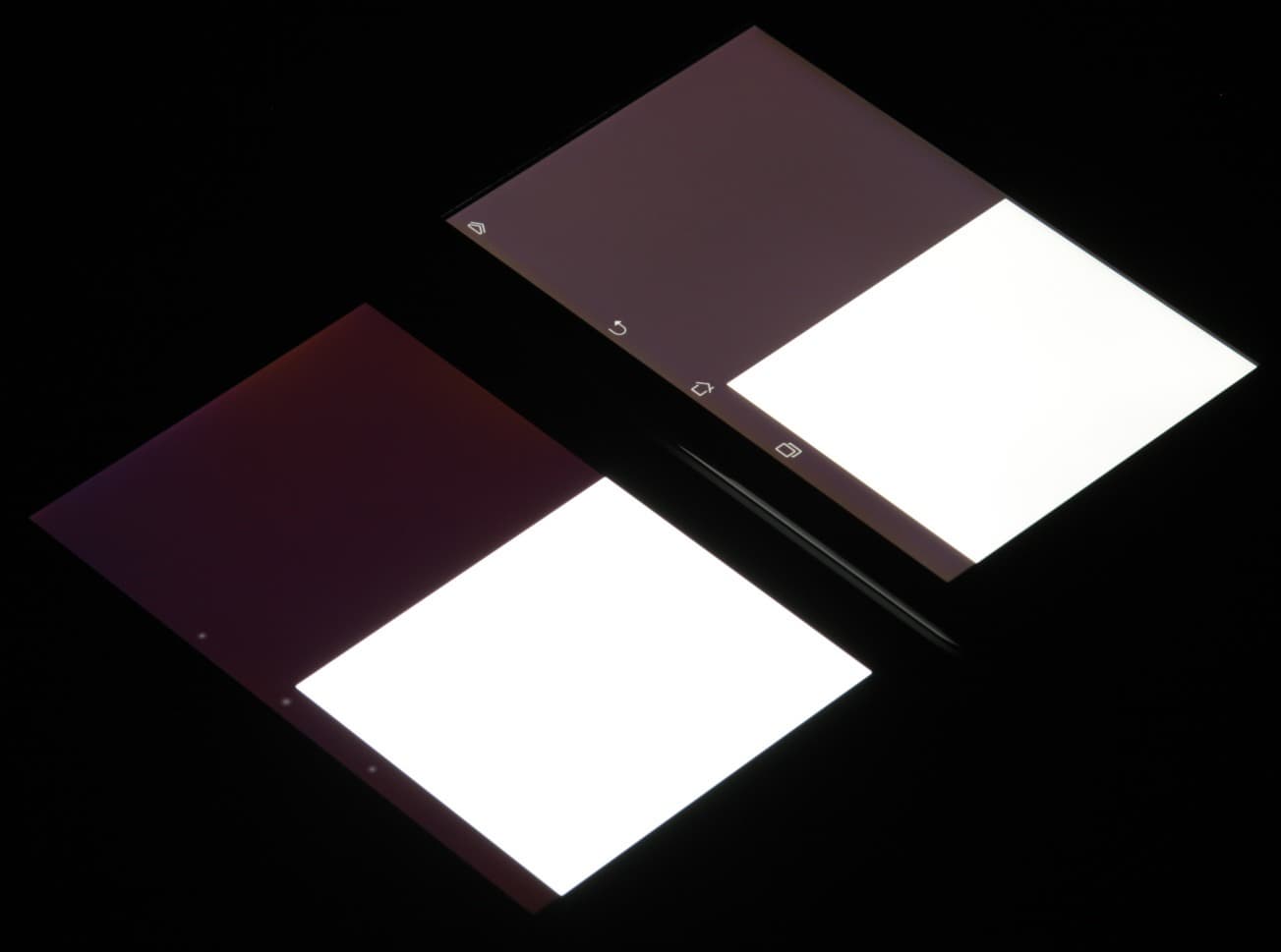 Экран имеет хорошие углы обзора без значительного сдвига цветов даже при больших отклонениях взгляда от перпендикуляра к экрану и без инвертирования оттенков. Для сравнения приведем фотографии, на которых на экраны смартфона и Nexus 7 выведены одинаковые изображения, при этом яркость экранов изначально установлена примерно на 200 кд/м². Перпендикулярно к экранам белое поле: