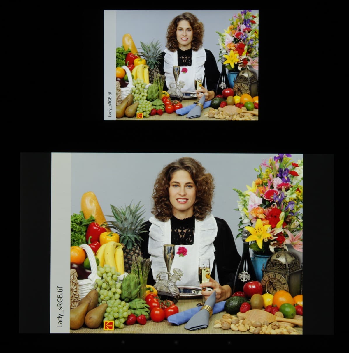 В итоге визуально цвета имеют естественную насыщенность. Баланс оттенков на шкале серого неплохой, так как цветовая температура пусть и выше к стандартных 6500 К, но отклонение от спектра абсолютно черного тела (ΔE) меньше 10, что для потребительского устройства считается приемлемым показателем. При этом цветовая температура и ΔE мало изменяются от оттенка к оттенку — это положительно сказывается на визуальной оценке цветового баланса. (Самые темные области шкалы серого можно не учитывать, так как там баланс цветов не имеет большого значения, да и погрешность измерений цветовых характеристик на низкой яркости большая.)