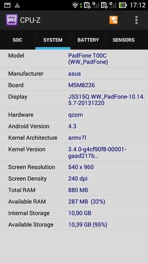 Аппаратная платформа Asus Padfone mini 4.3 строится на базе однокристальной системы (SoC) Qualcomm Snapdragon 400 (MSM8226). Центральный процессор здесь имеет 4 ядра ARM Cortex-A7, работающих на частоте 1,4 ГГц (CPU-Z подтверждает эту частоту). Оперативной памяти в устройстве предусмотрен 1 ГБ, а хранилище, доступное пользователю для загрузки собственных файлов, составляет около 10 ГБ из номинально обозначенных 16 ГБ — остальное ушло на саму систему и приложения. Память можно нарастить за счет карточек microSD объемом до 32 ГБ, а также можно подключить флэш-накопитель через OTG-переходник — аппарат данный режим поддерживает.