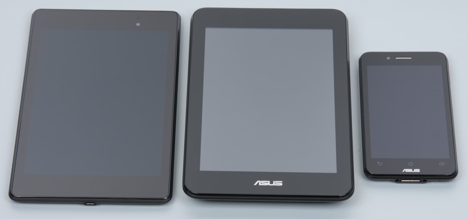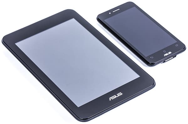 Лицевая поверхность экрана выполнена в виде стеклянной пластины с зеркально-гладкой поверхностью, устойчивой к появлению царапин. Судя по отражению объектов, имеется эффективный антибликовый фильтр, который по снижению яркости отражения не хуже, чем у Google Nexus 7 (2013) (далее просто Nexus 7). Для наглядности приведем фотографию, на которой в выключенных экранах отражается белая поверхность (слева — Nexus 7, по центру — док-станция, справа — сам смартфон Asus PadFone mini 4.3, далее их — Nexus 7 и смартфон — можно различать по размеру):