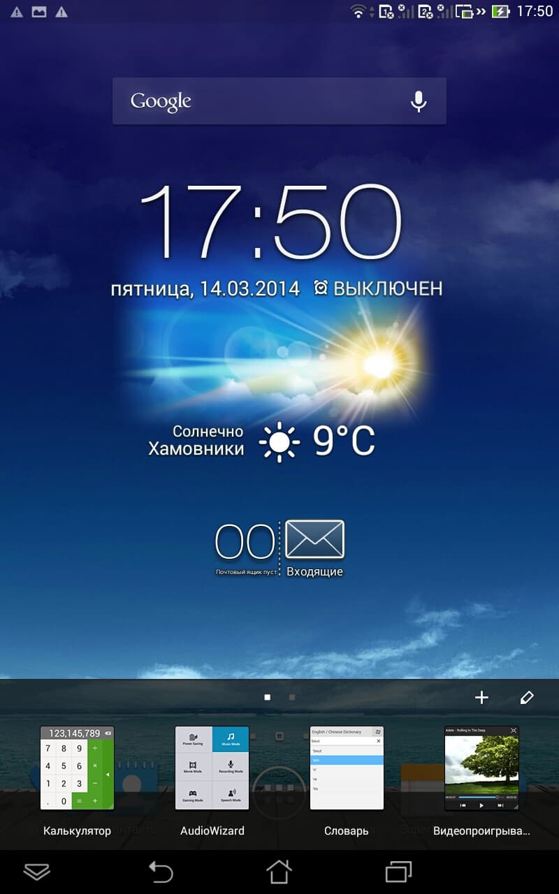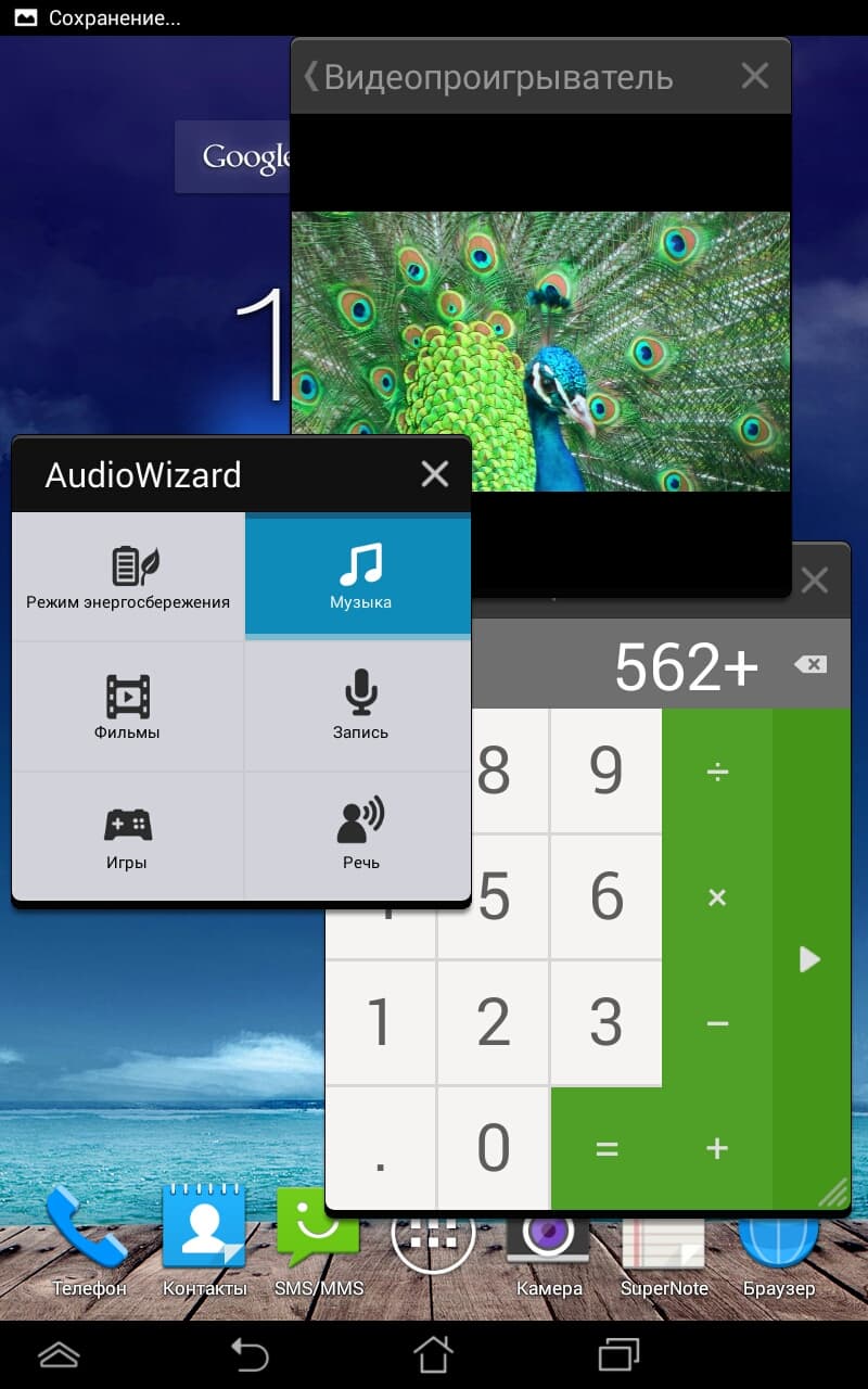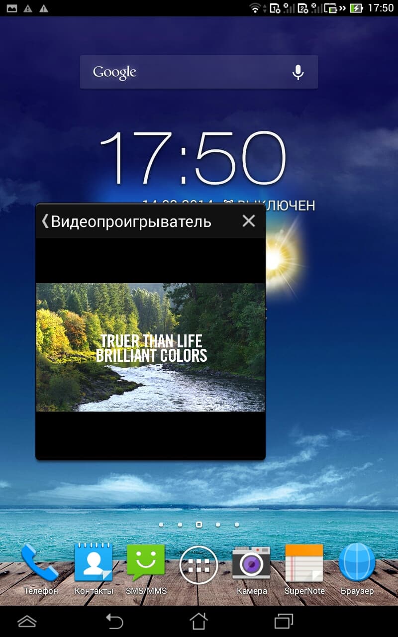 Еще можно отметить, что в режиме планшета у устройства появляется возможность работы в многооконном режиме — но не с любыми приложениями, а только с теми, которые можно выбрать из отдельного контекстного меню, всплывающего снизу по нажатию на специальную дополнительную кнопку на экране (в ряду виртуальных кнопок управления она крайняя слева). То есть из этого меню можно запустить в маленьких окошках на экране одновременно до трех приложений, таких как видеопроигрыватель, калькулятор, словарь, заметки и др.