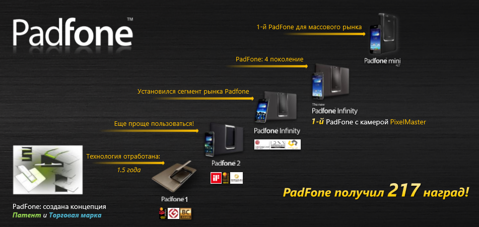 Собственно, история данной необычной серии гибридных трансформируемых устройств, находящихся на стыке между смартфонами и планшетами, началась не так давно — примерно в середине 2012 года, когда в продажу вышел первенец линейки под соответствующим названием Asus Padfone. Устройство представляло собой эдакую матрешку, состоящую из смартфона, планшетного модуля и клавиатурной док-станции. Концепция вызвала интерес своей новизной, но в коммерческом плане модель не явилась прорывом. Сразу же за ней, буквально через пару месяцев, вышла и вторая модель линейки под названием Padfone 2. Она уже была лишена клавиатурного блока, а состояла лишь из двух частей — непосредственно смартфона и док-станции (с дополнительным экраном, динамиком и батареей), в которую этот смартфон вставлялся. Собственно, такой форм-фактор в итоге и прижился, и в дальнейшем все модели серии выпускались и продолжают выпускаться именно в таком составе: смартфон плюс док-станция.