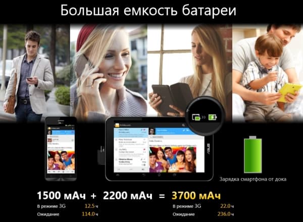 Проведя измерения точно таким же способом, как и в случае с Asus Padfone Infinity, то есть разрядив в ноль батарею самого смартфона и вставив его в док-станцию с заряженной на 100% собственной батареей в интеллектуальном режиме работы, мы выяснили, что аппарат смог продержаться в полтора раза дольше. Полученные нами данные, кстати, совпадают с приводимыми на презентациях самими разработчиками: в режиме планшета с помощью дополнительной батареи аппарат способен проигрывать видео около 7,5 часов. Ну а в игровом режиме к нашим трем часам дополнительная батарея добавила еще более полутора часов, удлинив процесс игры до без малого 5 часов. Согласно данным тех же представителей Asus, работа устройства в режиме разговора и в режиме ожидания увеличивается за счет док-станции в целых два раза.
