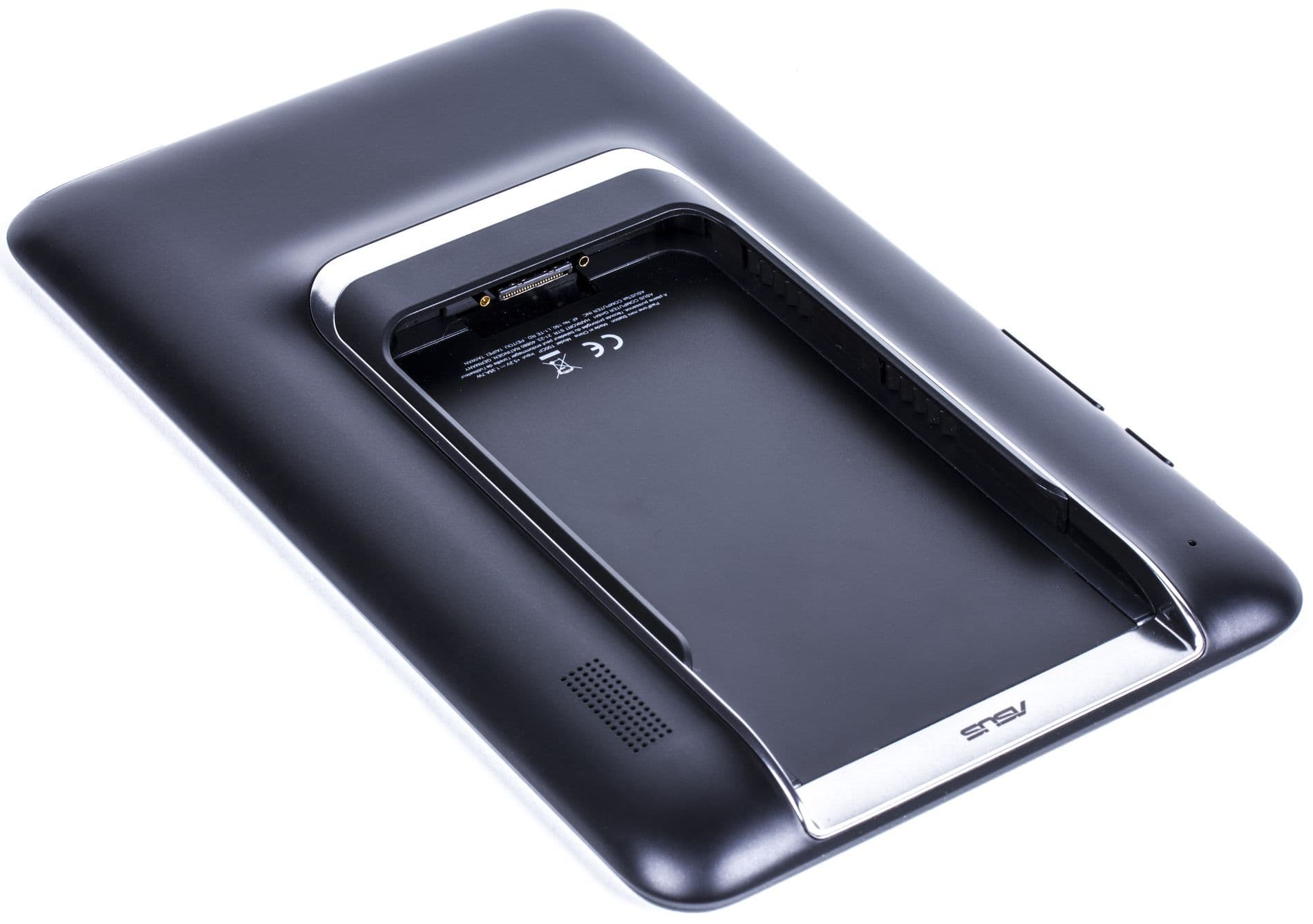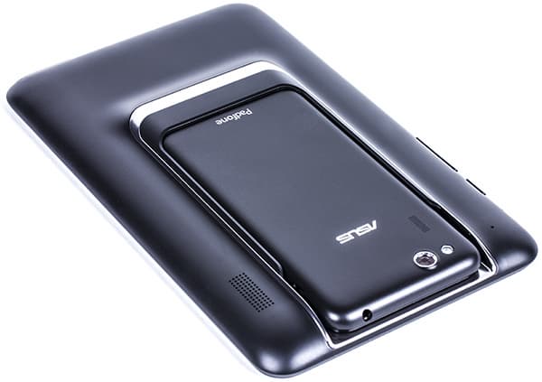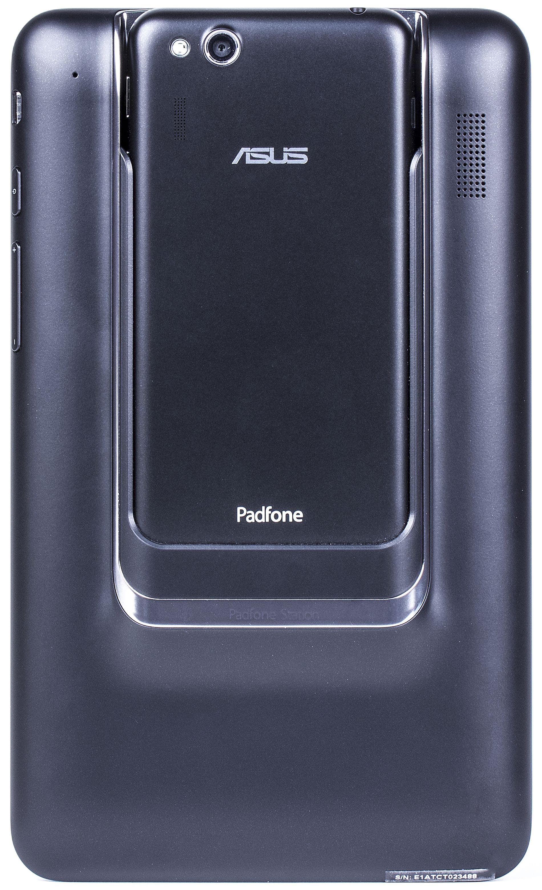 Задняя пластиковая поверхность имеет такую же слегка прорезиненную структуру, как у крышки смартфона, поэтому планшетный модуль достаточно надежно удерживается в руке. Но все равно по сравнению с обычным среднестатистическим планшетом это очень толстая и достаточно тяжелая конструкция, да еще и с неплоской задней стенкой. Впрочем, несмотря на эти выступающие сзади салазки, в которые вставляется смартфон, планшет лежит на ровной поверхности весьма устойчиво и совершенно не покачивается.