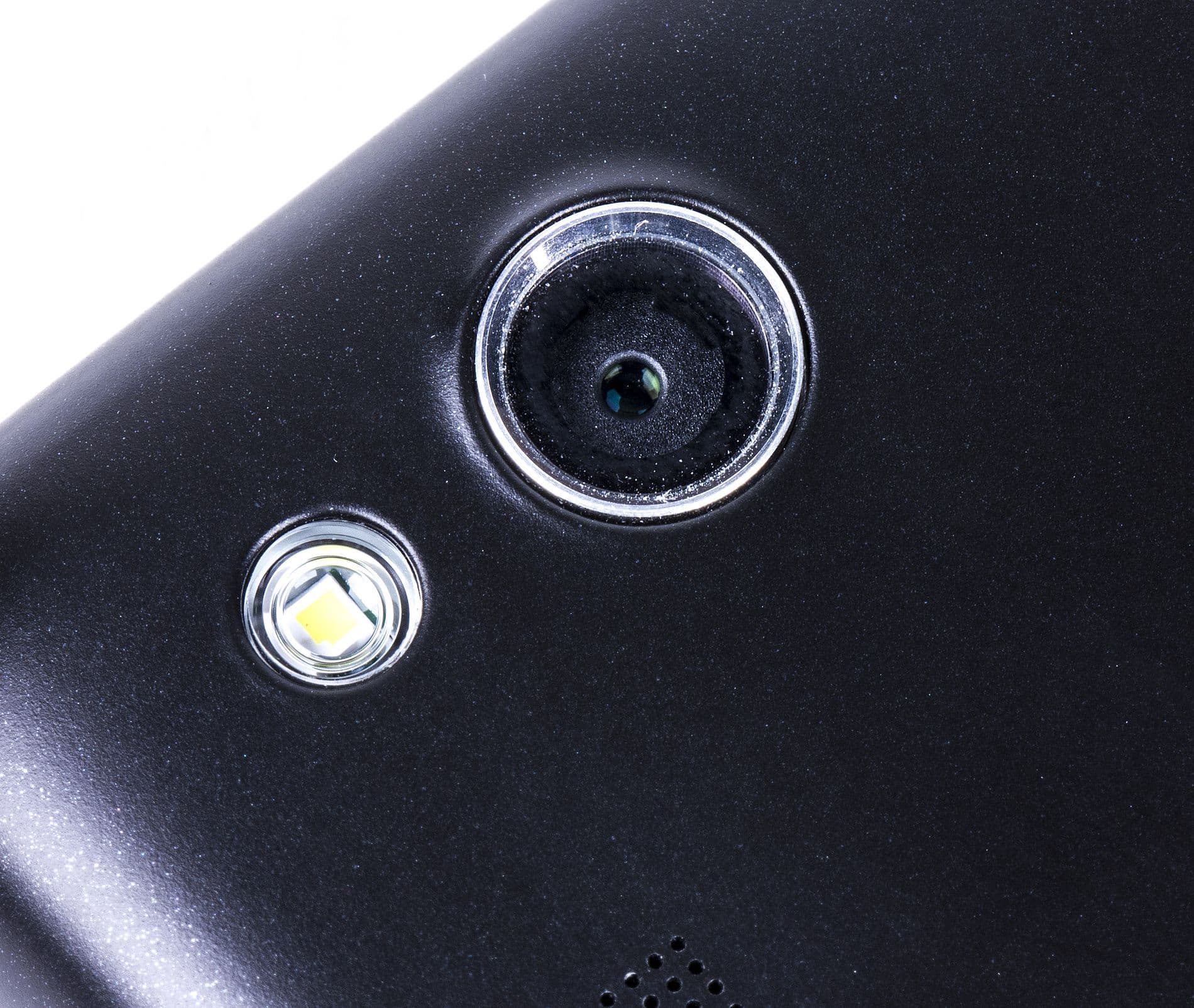 На задней панели смартфона в верхней части друг рядом с другом расположились круглое окошко камеры, глазок односекционной светодиодной вспышки и решетка вызывного динамика. Стекло камеры обрамлено блестящим хромированным колечком, решетка динамика перекрывается поверхностью стола, отчего звук лежащего смартфона отчасти приглушается, а вспышка не имеет предустановленного ПО, сходу позволяющего задействовать ее в качестве фонарика.
